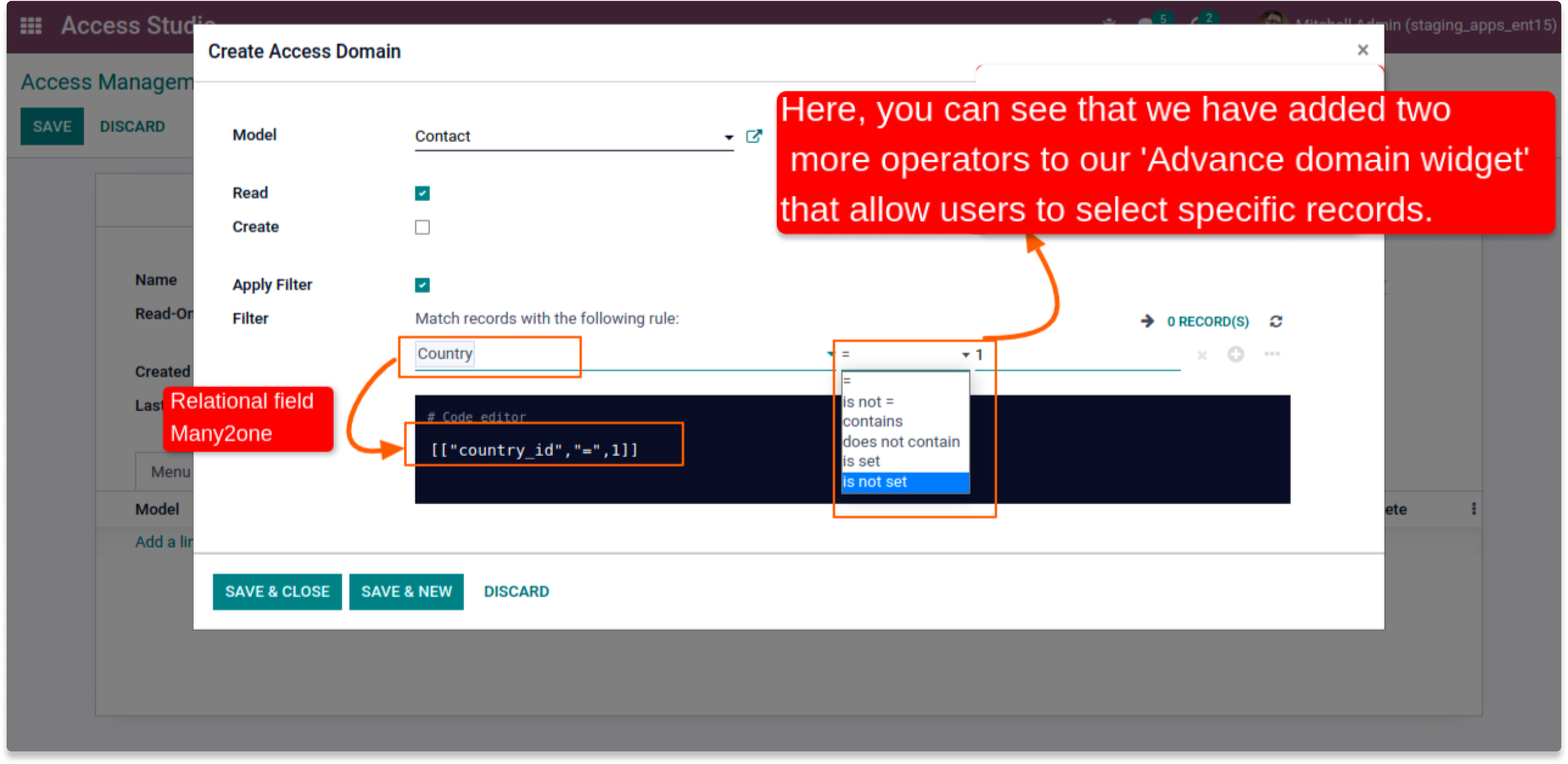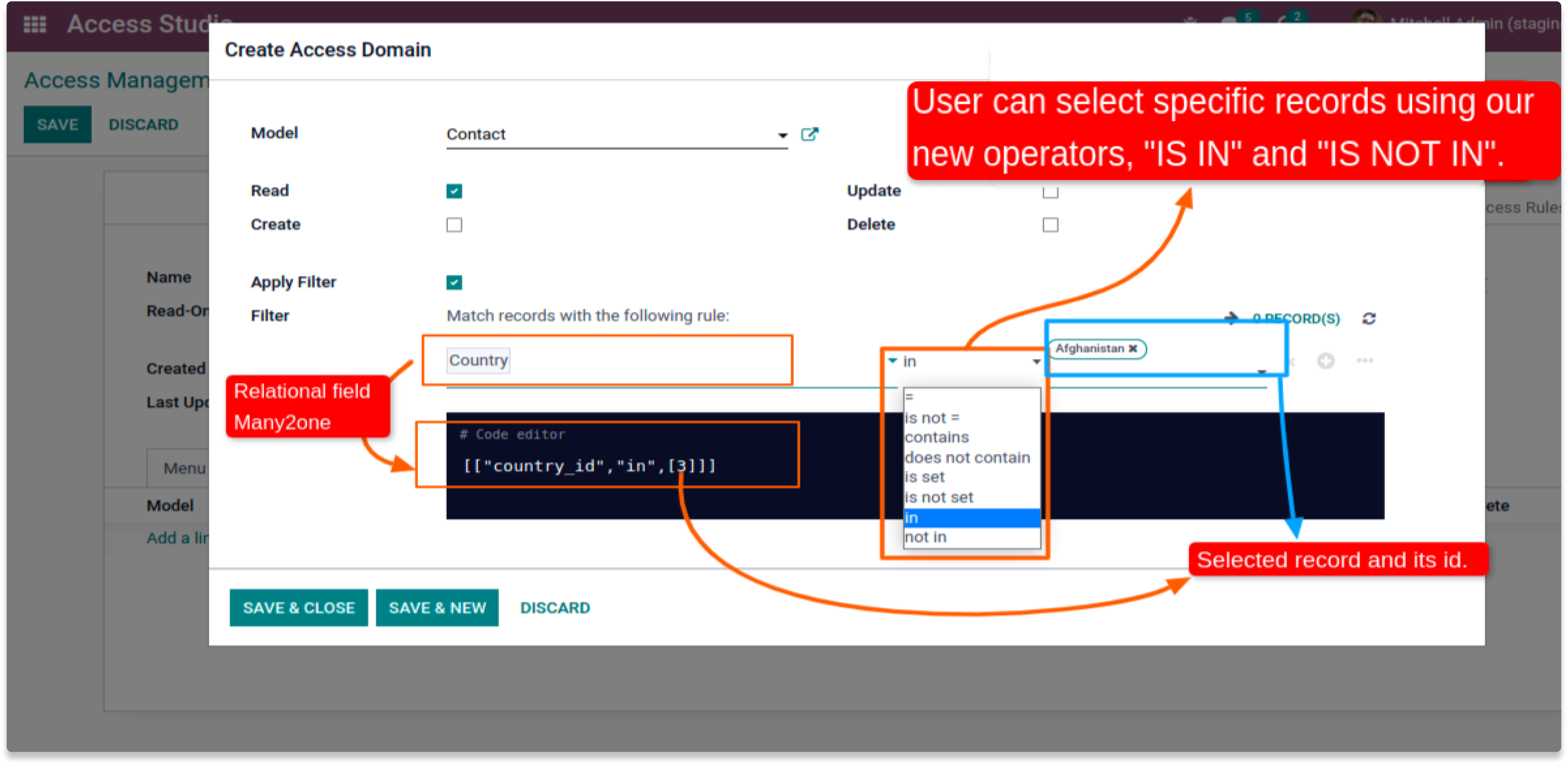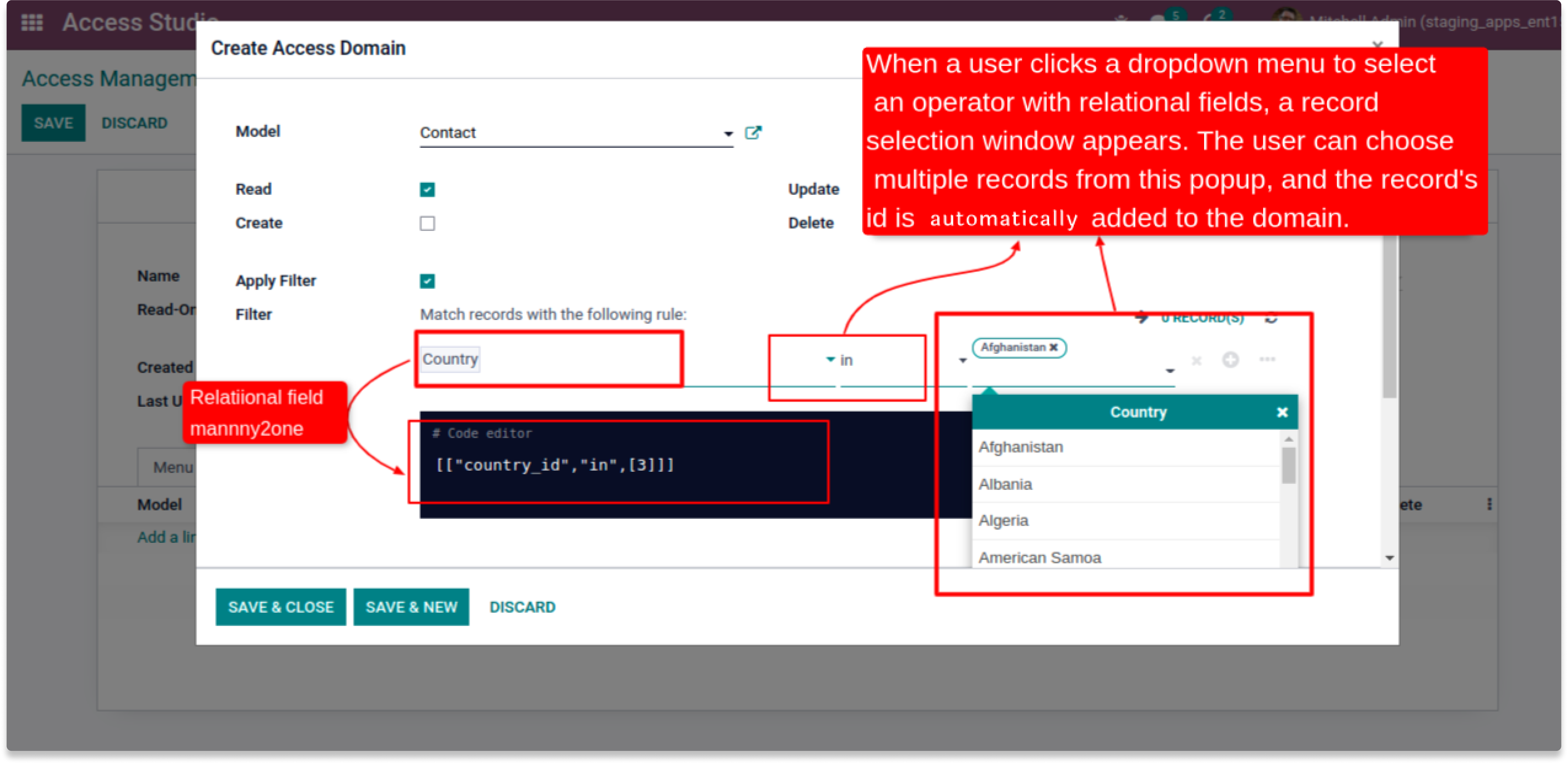 This module provides domains with an additional feature to select any models record while using any relational field and create a domain after selecting it. for that, we provide two additional operators ('in' and 'not in') that allow the user to select a record of any model. after select any record, its id automatic adds in domain.