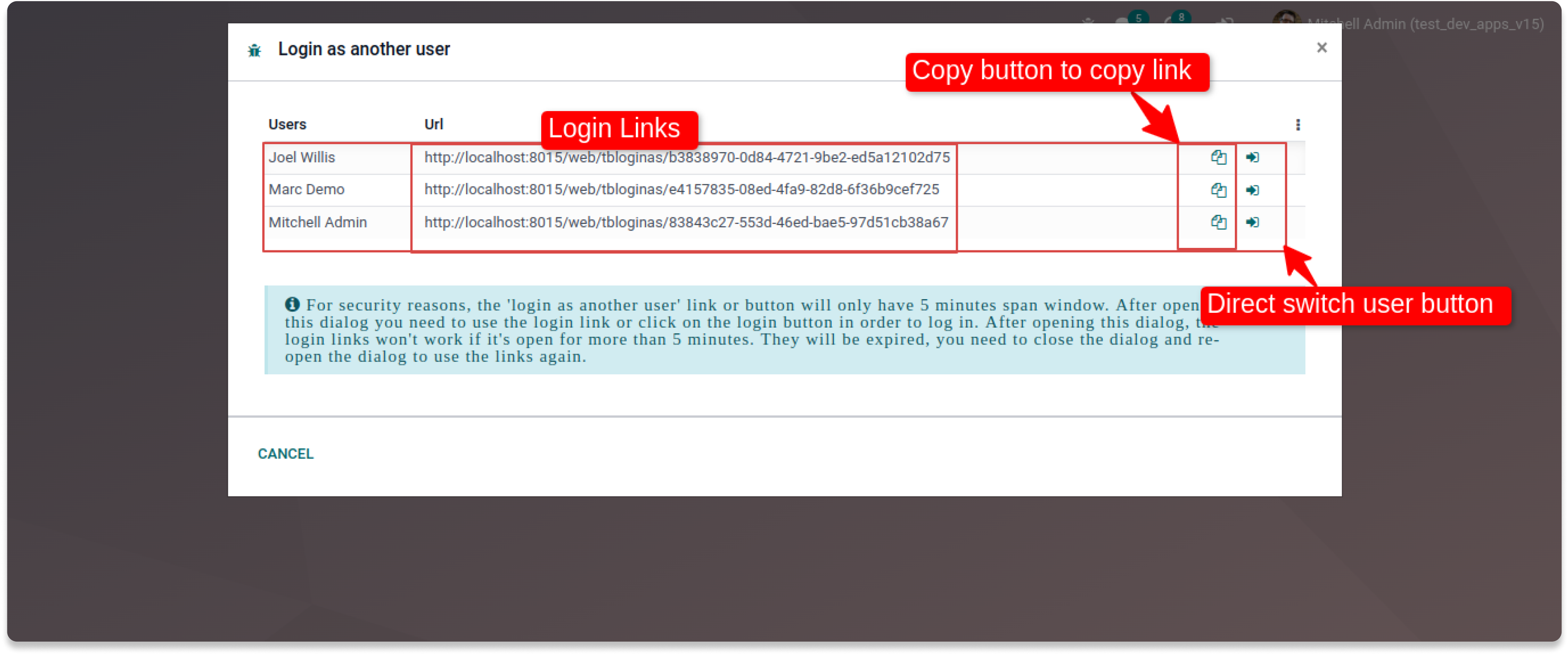 This module allows administrators to switch between multiple users by just siiingle click and without knowing Credentials. They can generate temporary login links and share it to their clients or users for the temparary purpose.