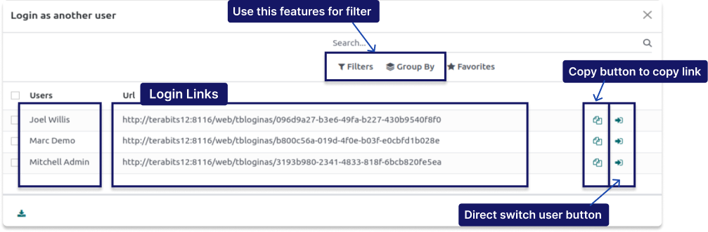 This module allows administrators to switch between multiple users by just siiingle click and without knowing credentials. They can generate temporary login links and share it to their clients or users for the temparary purpose.