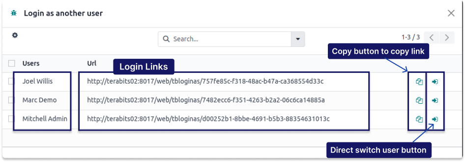 You can copy any links by copy button and paste any browser to direct login with that user. And