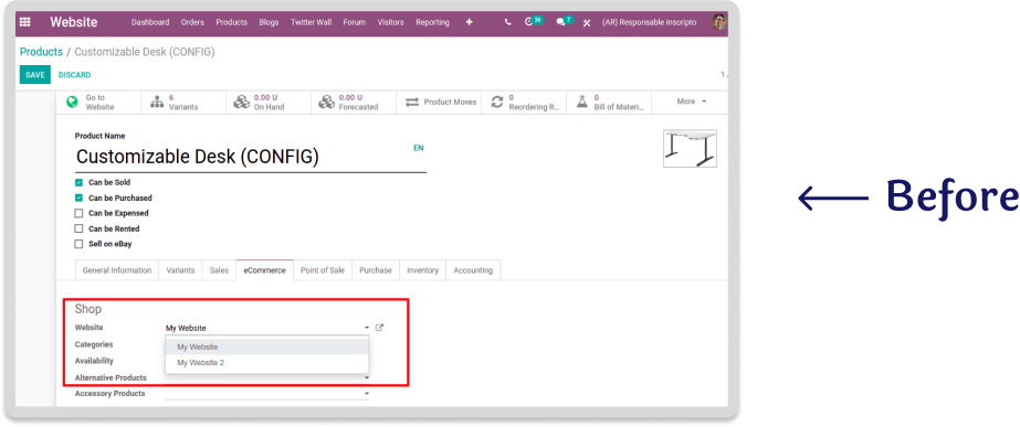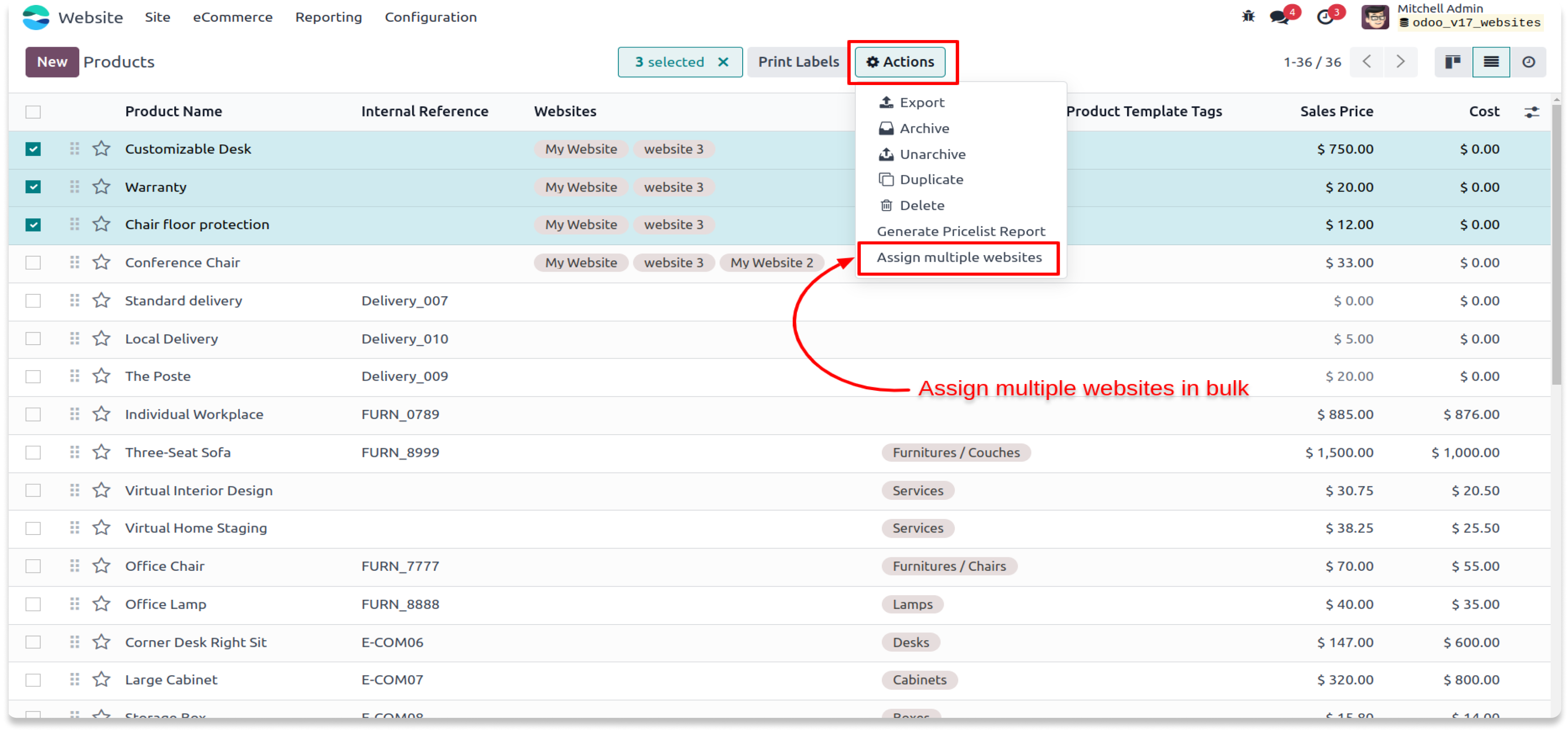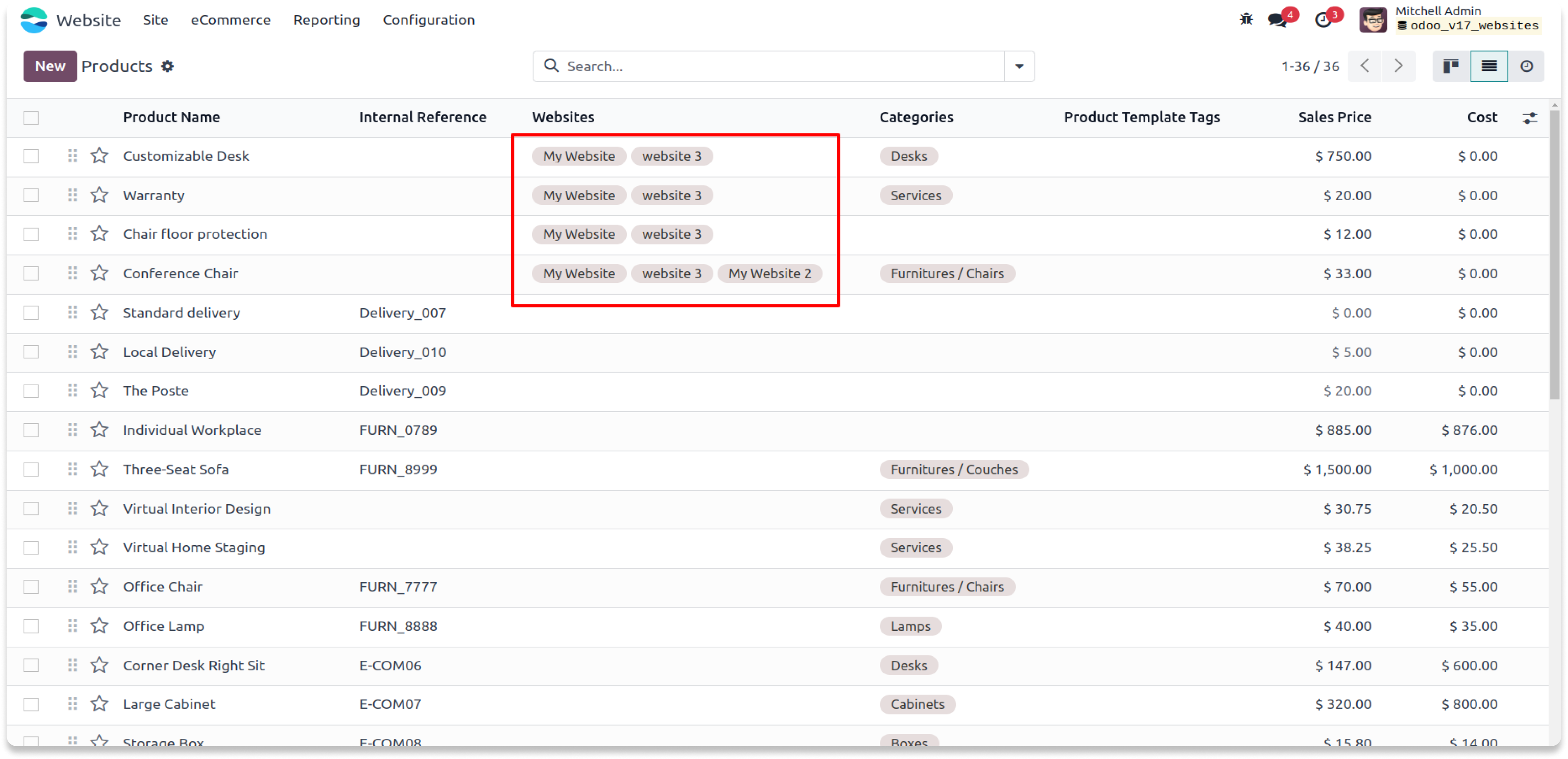 To use, go to Website > Products > Product Templates and then go to the 'Ecommerce' tab and add the websites you need to load your product or leave it empty to load the product to all the websites.