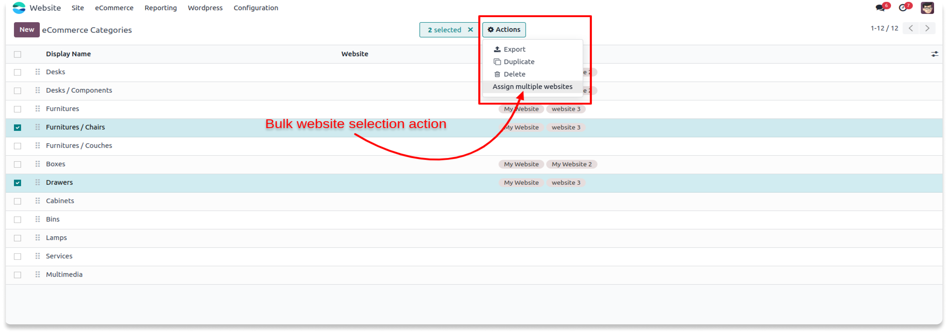 Odoo's core multi website feature only allows you to select one website per product or none, but it doesn't allow you to select 2 or more websites per product or category.
