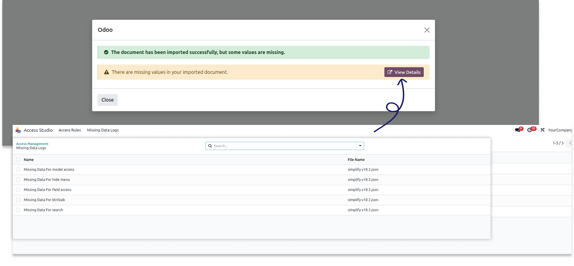 - If there is any missing records, you will the warning as shown below. and all the missing records will be visible into the missing data log menu located on the top.
