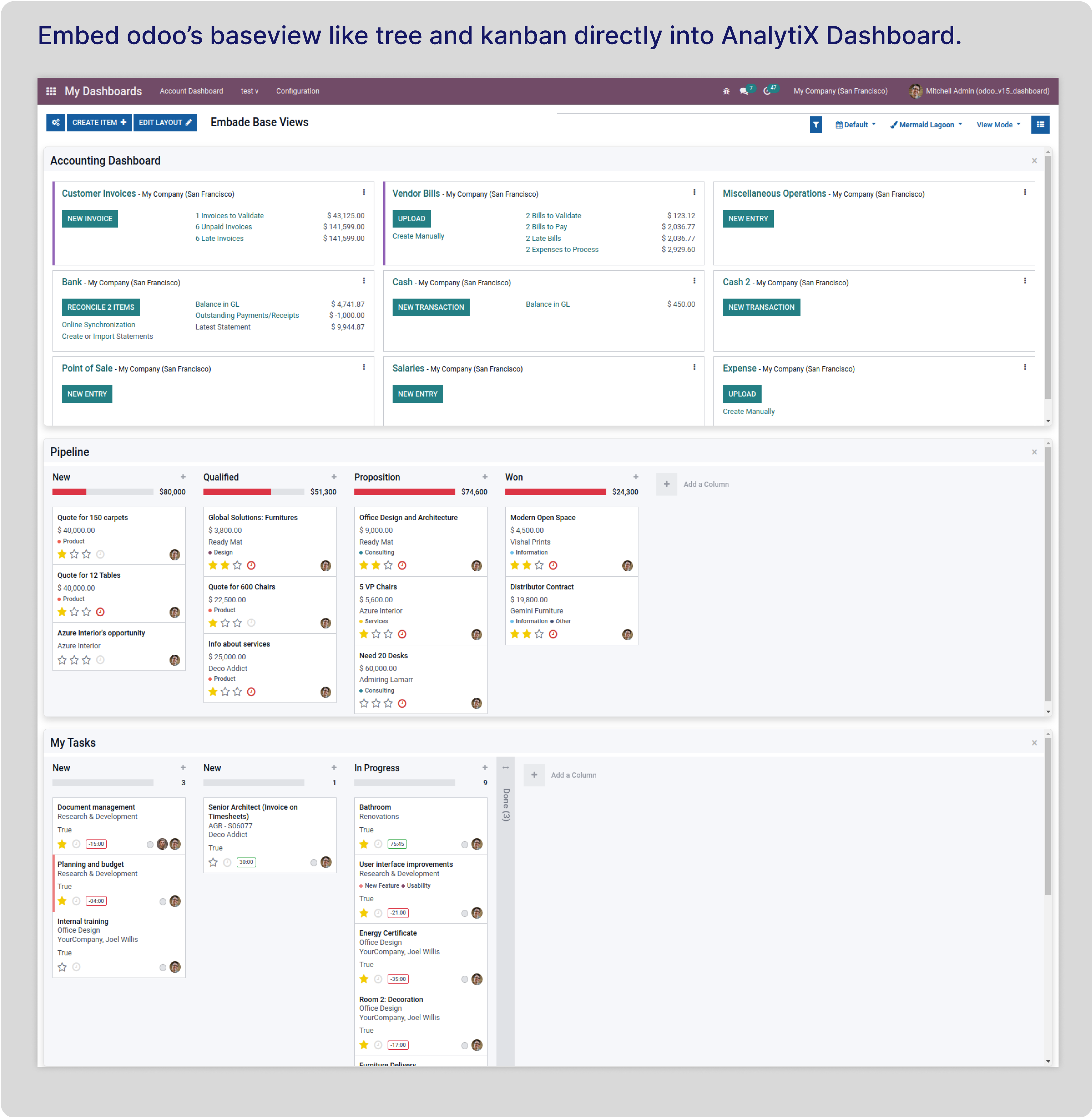 Embed base module's view (form, tree, kanban, calender, pivot, etc) into your dashboard with applied filter.