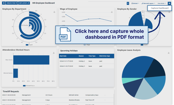 Absolutely! Base module views like forms, trees, kanbans, calendars, and pivots can be embedded into the dashboard with applied filters, allowing for a comprehensive view of relevant data.