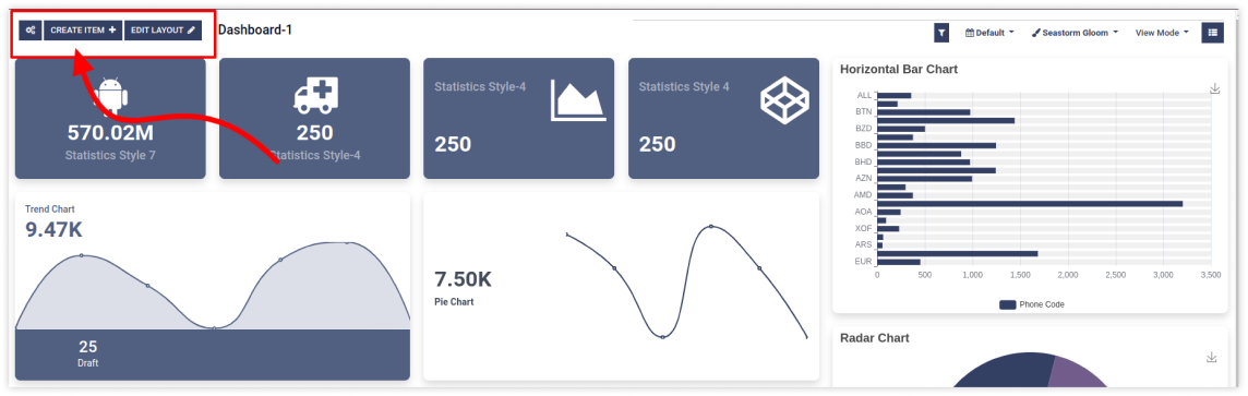 After opening the created dashboard you can see the Create Item button. You can create dashboard items from there. And edit the dashboard layout by clicking on Edit layout button.