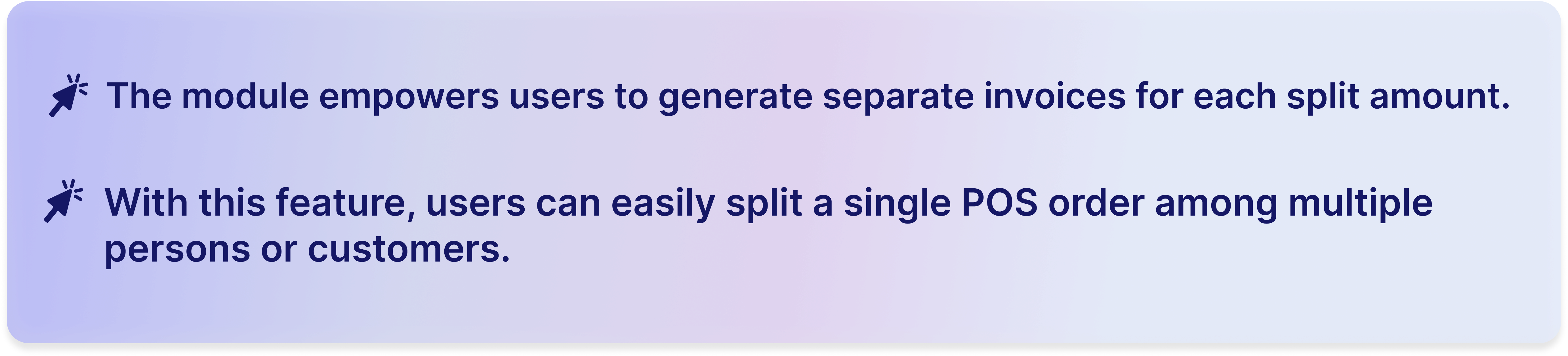 Odoo only allows you to split order/bill by product or product quantity. With this module you can split bills by persons or by a specified number. This means that you can create separate bills for each person in a group. This is a valuable feature for businesses that serve large groups of customers.
