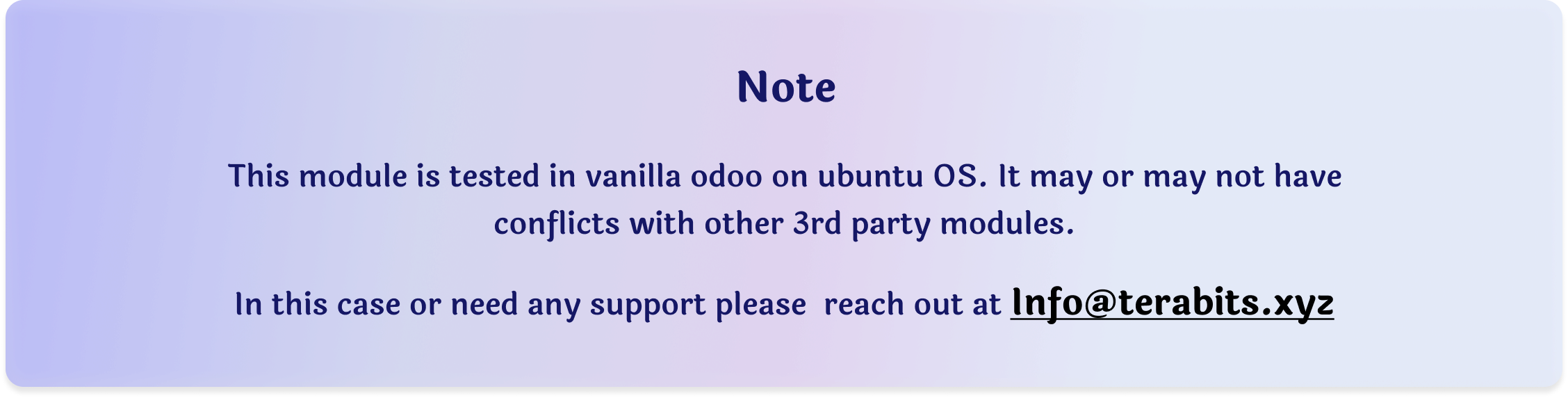 Please drop an email at info@terabits.xyz or raise a ticket through the Odoo store itself.