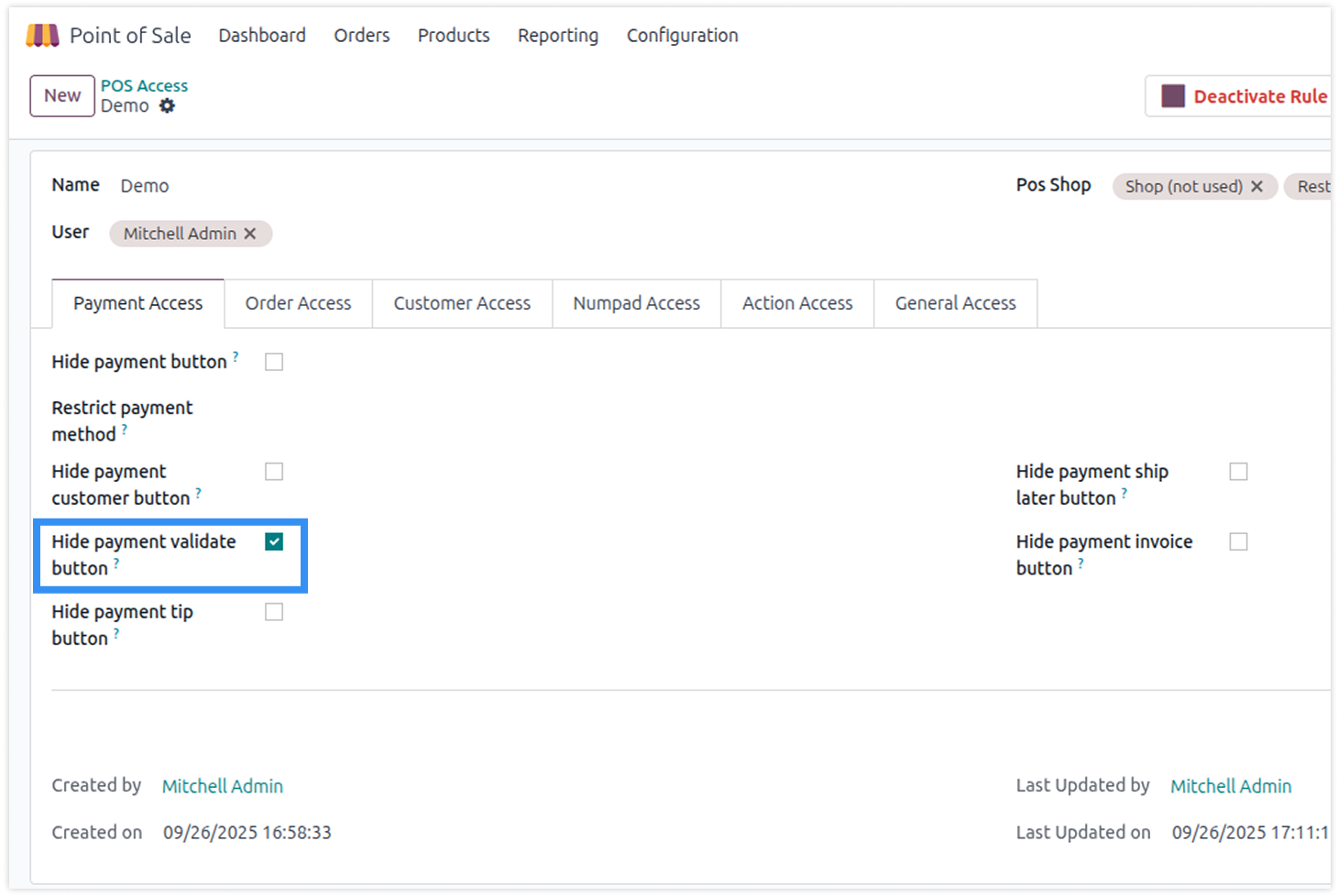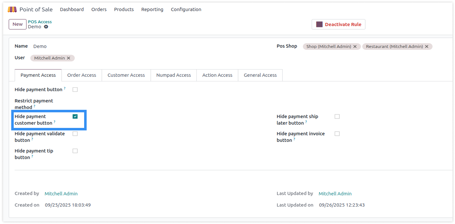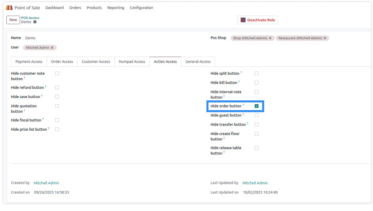 The order access tab allows you create rules for specific users to hide menu categories, delete and activate order buttons with a single click.