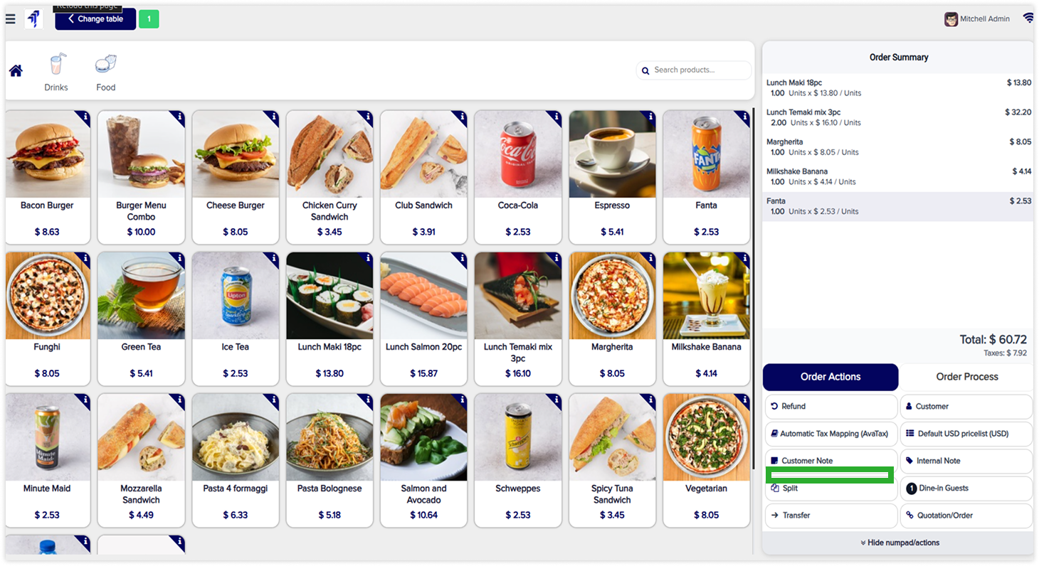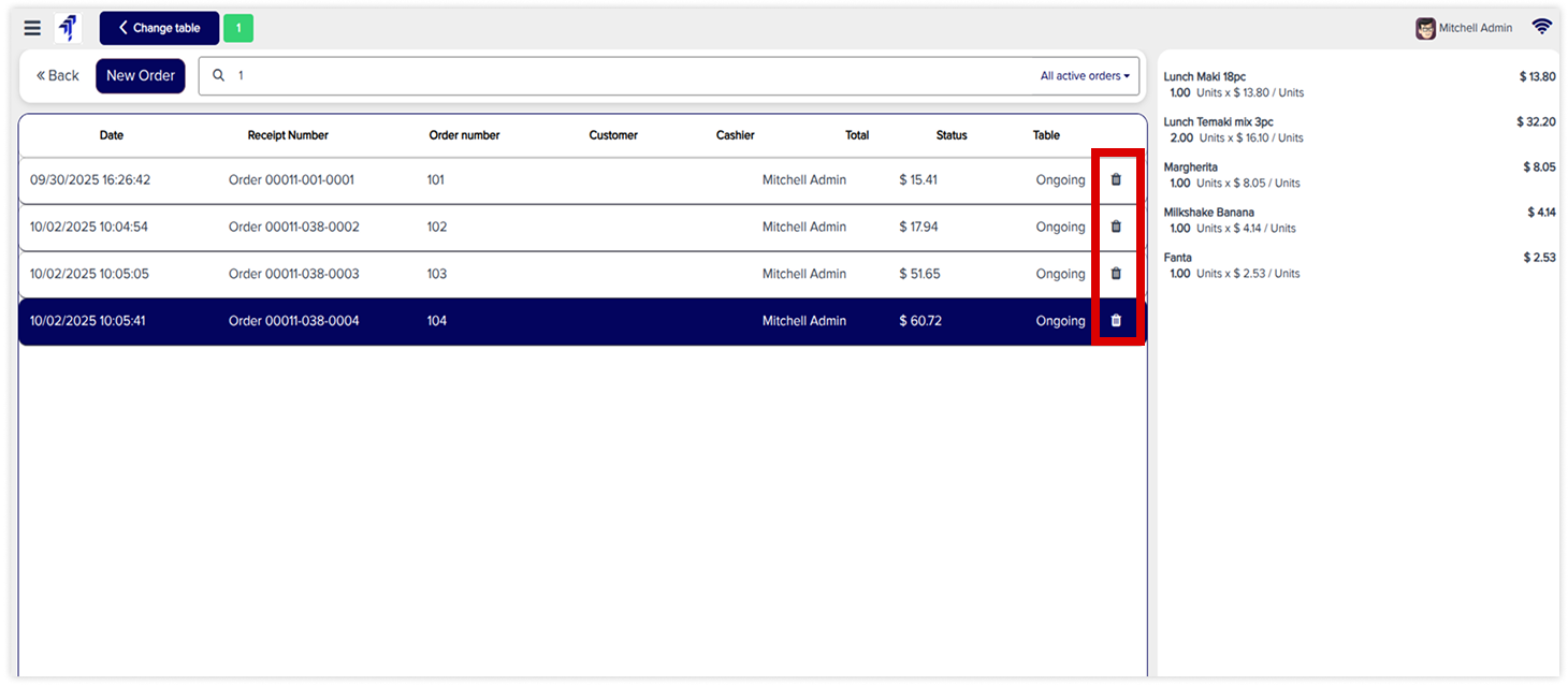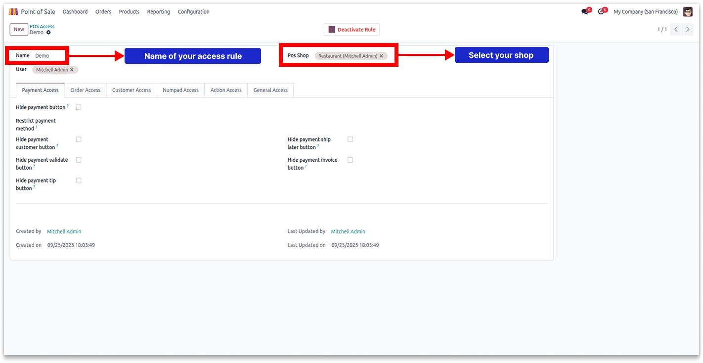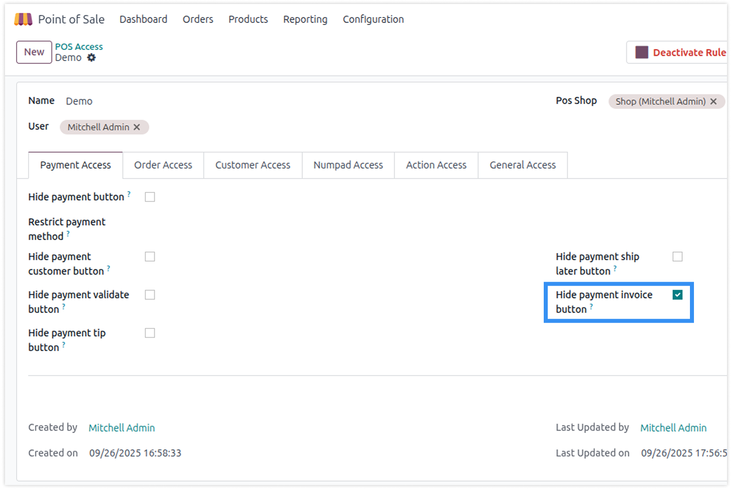 The order access tab allows you create rules for specific users to hide menu categories, delete and activate order buttons with a single click.