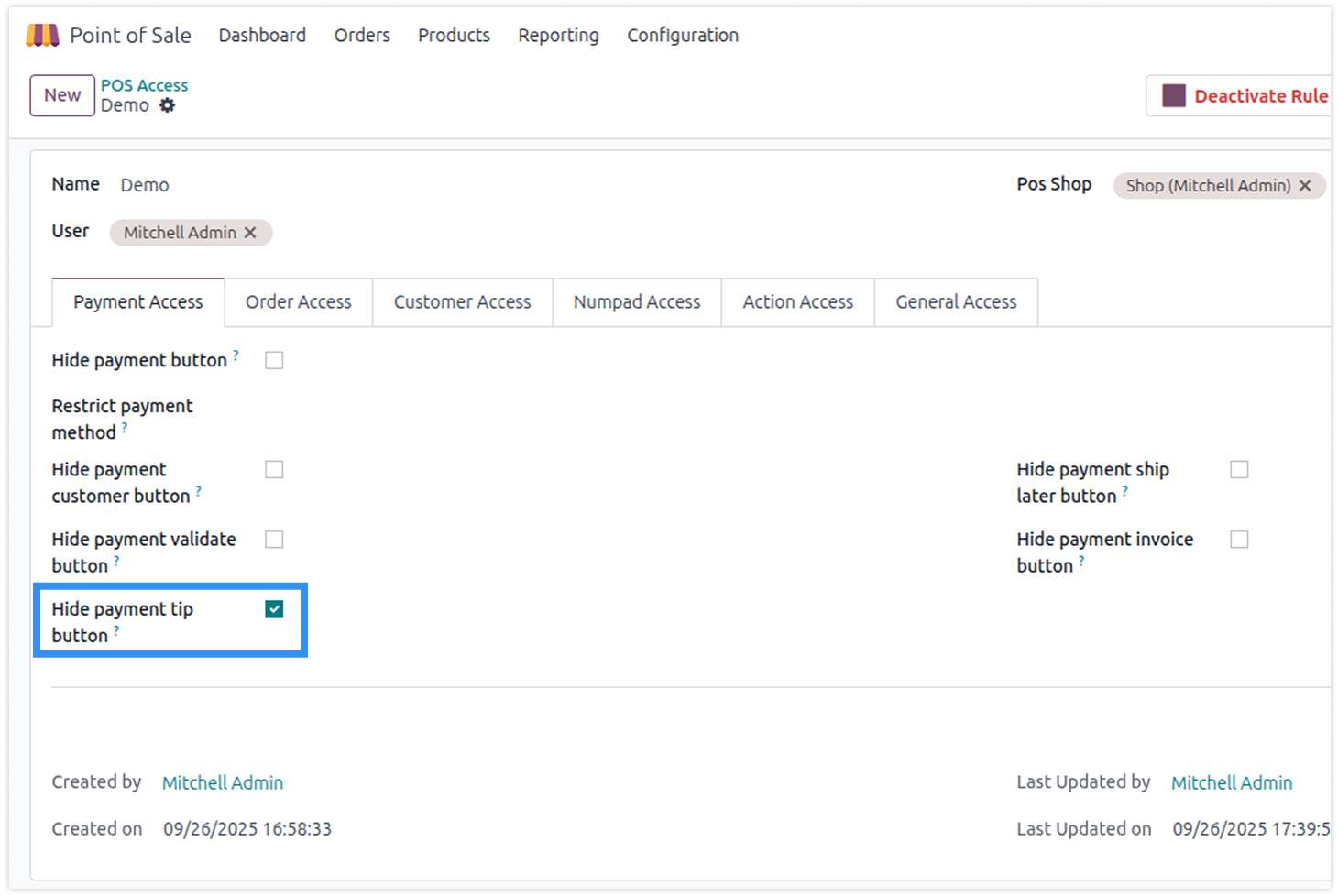 Payment access rights restrict payment actions such as buttons for methods, customers, validation, tips, shipping tips, and invoices.