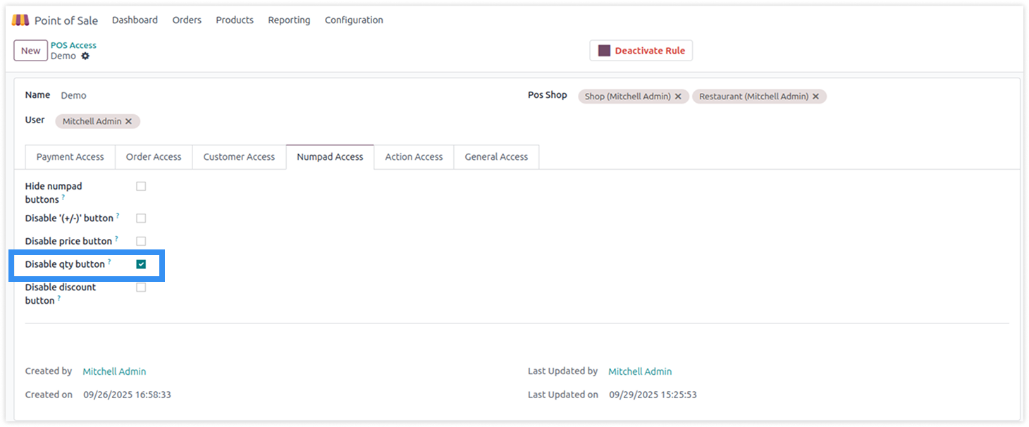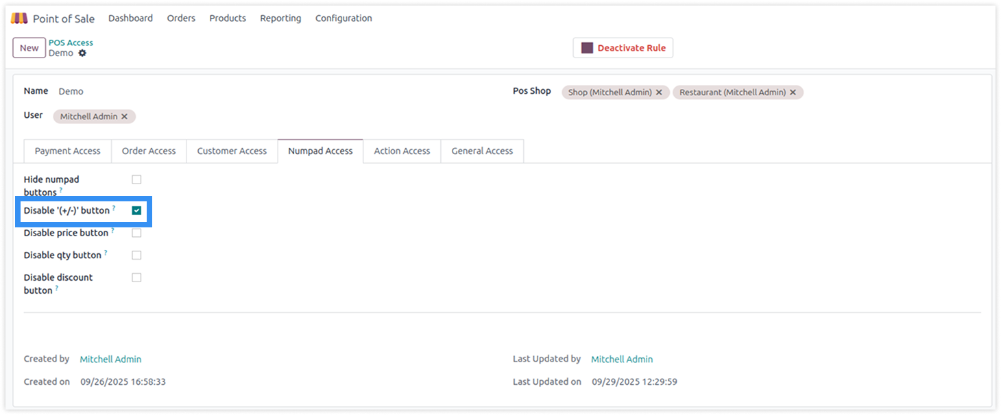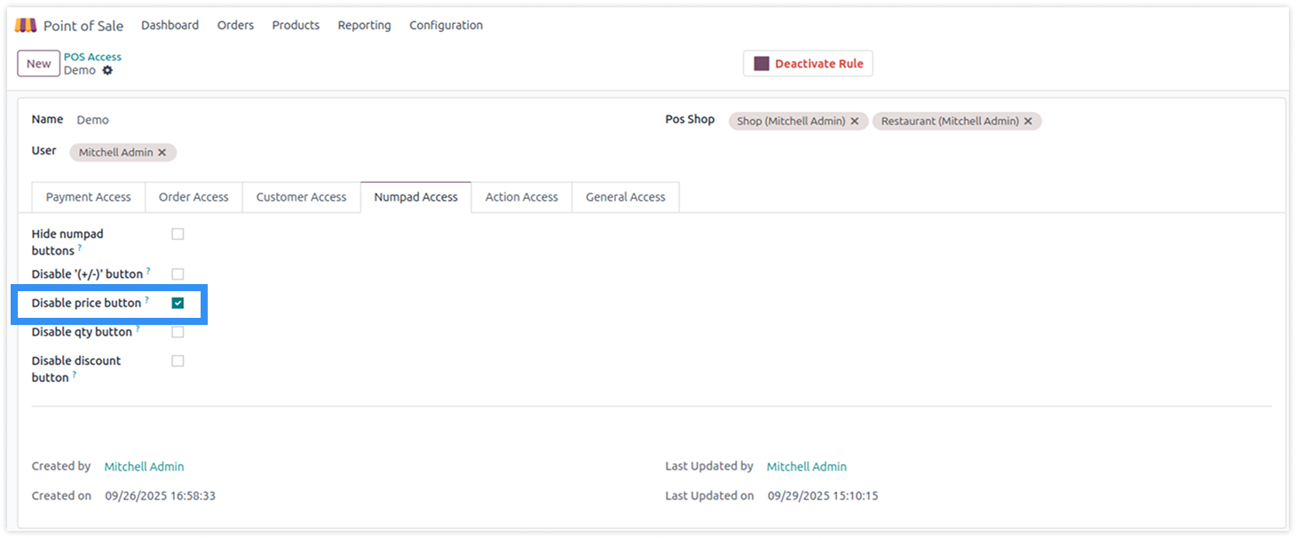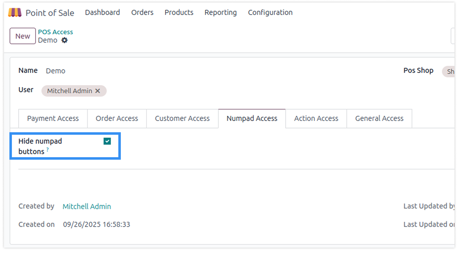 This tab allows you to manage user-specific numpad access rights. Hide the entire numpad or disable certain numpad features such as price, quantity, discount, and minus/plus (+/-).