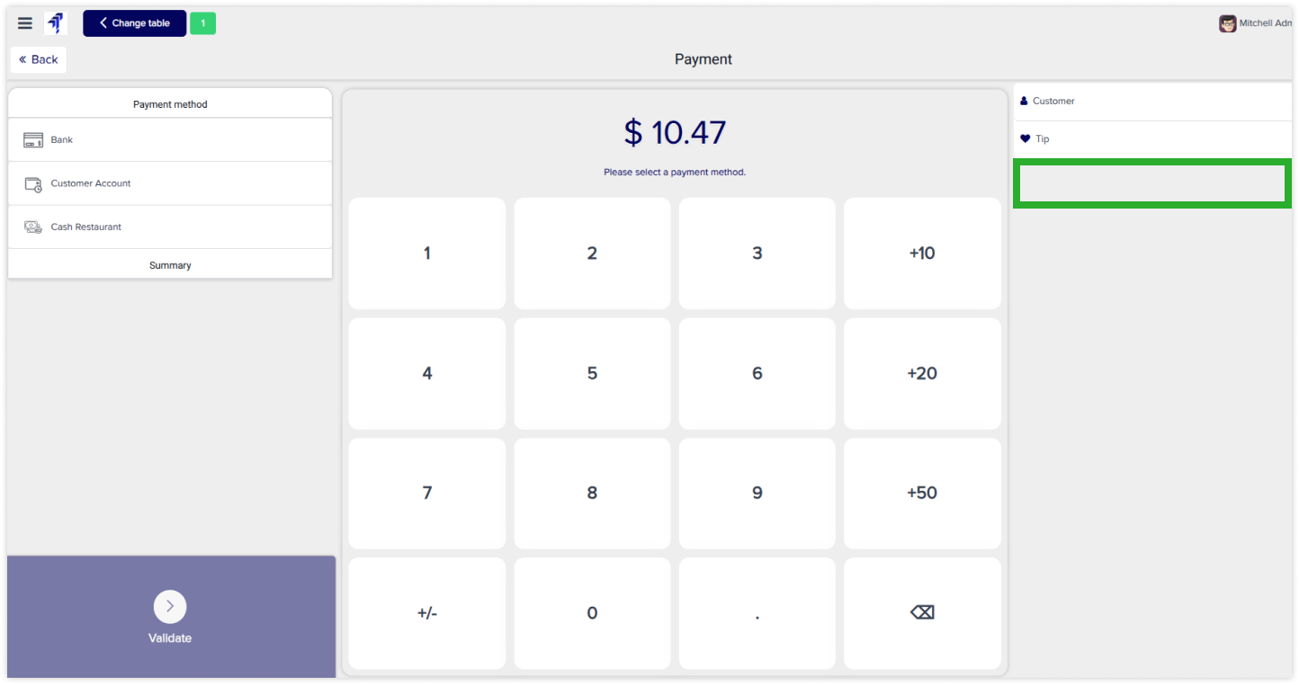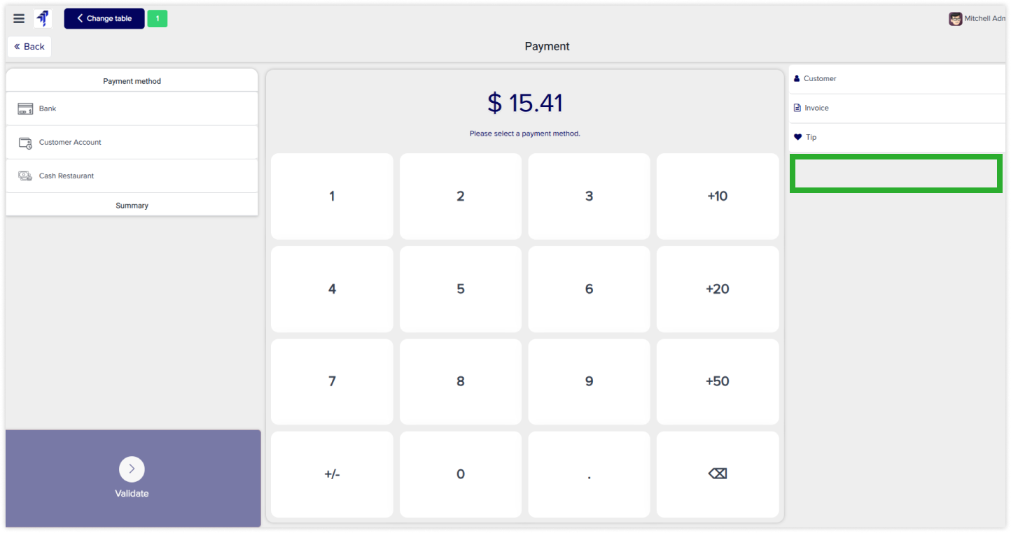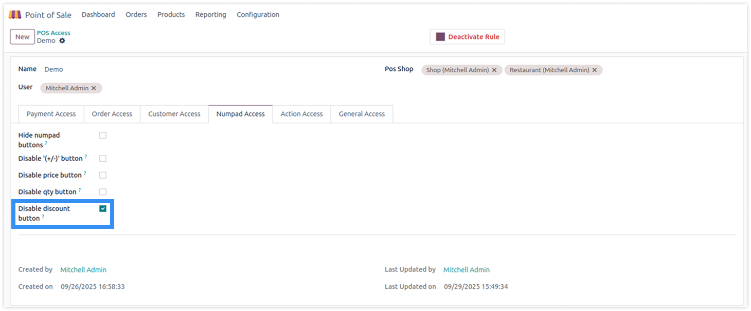 This tab allows you to manage user-specific numpad access rights. Hide the entire numpad or disable certain numpad features such as price, quantity, discount, and minus/plus (+/-).