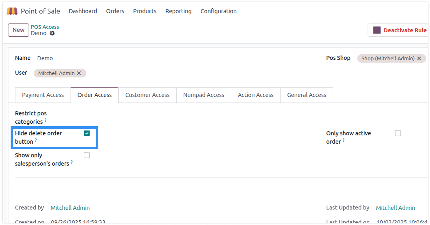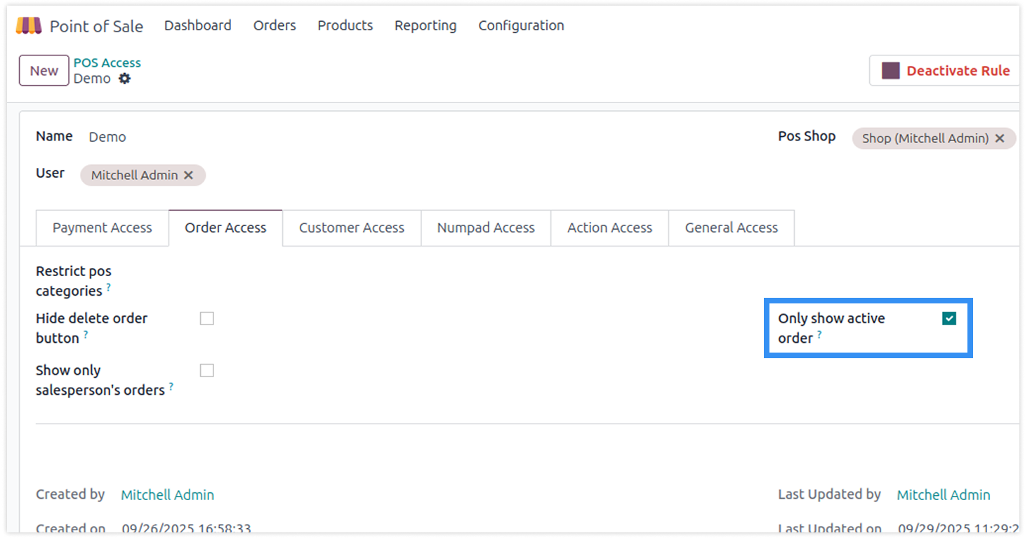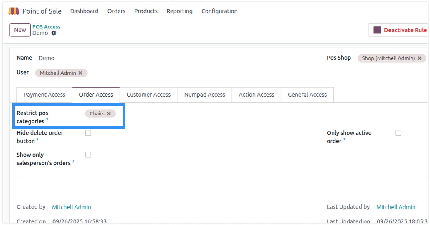 Order access rights restrict POS categories, disables order deletion, and shows only active orders.