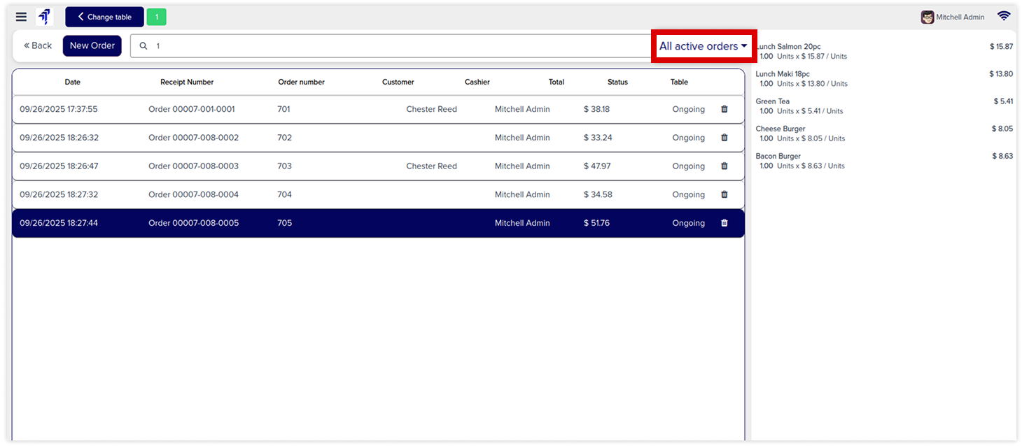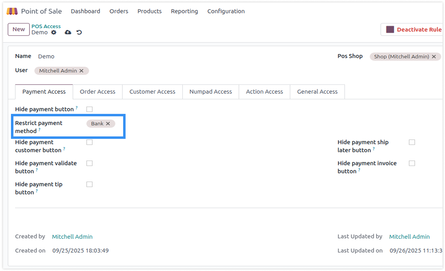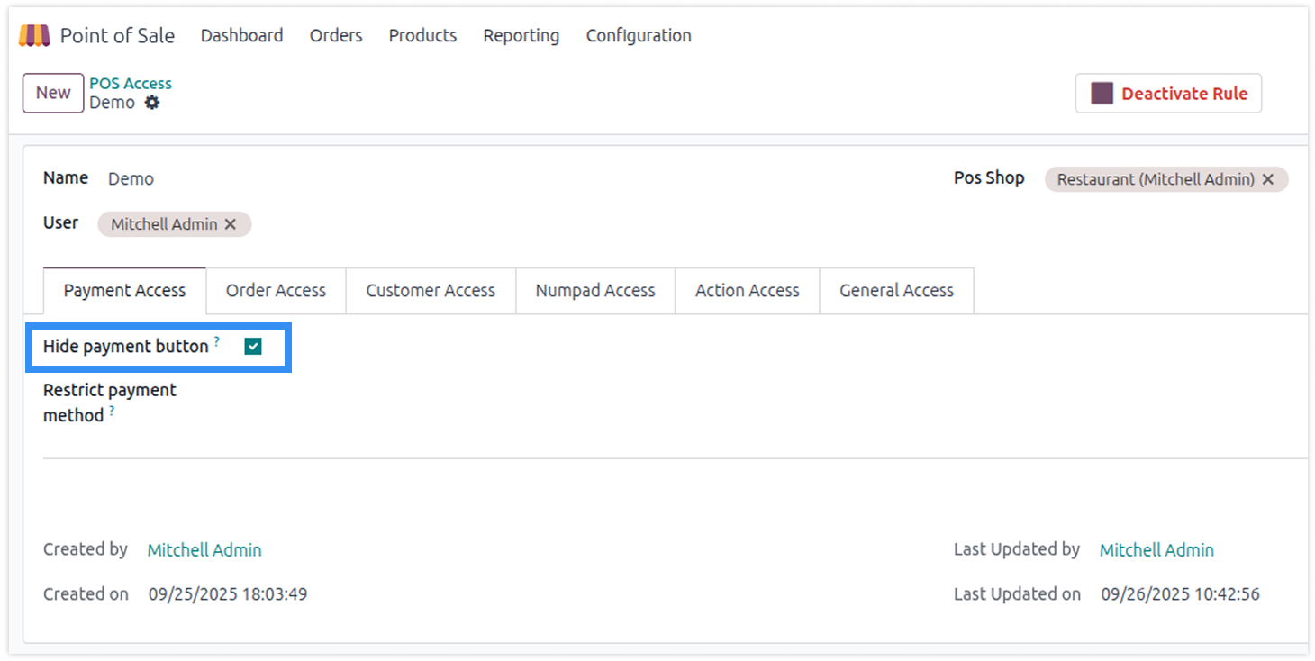 Order access rights restrict POS categories, disables order deletion, and shows only active orders.