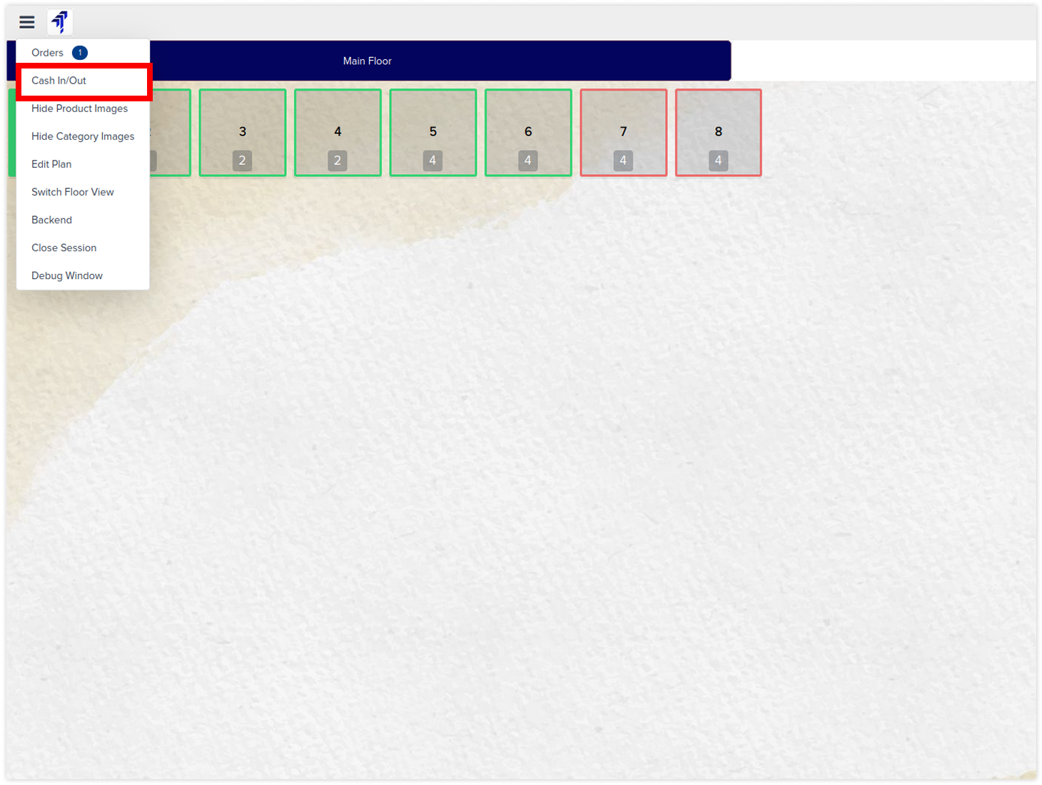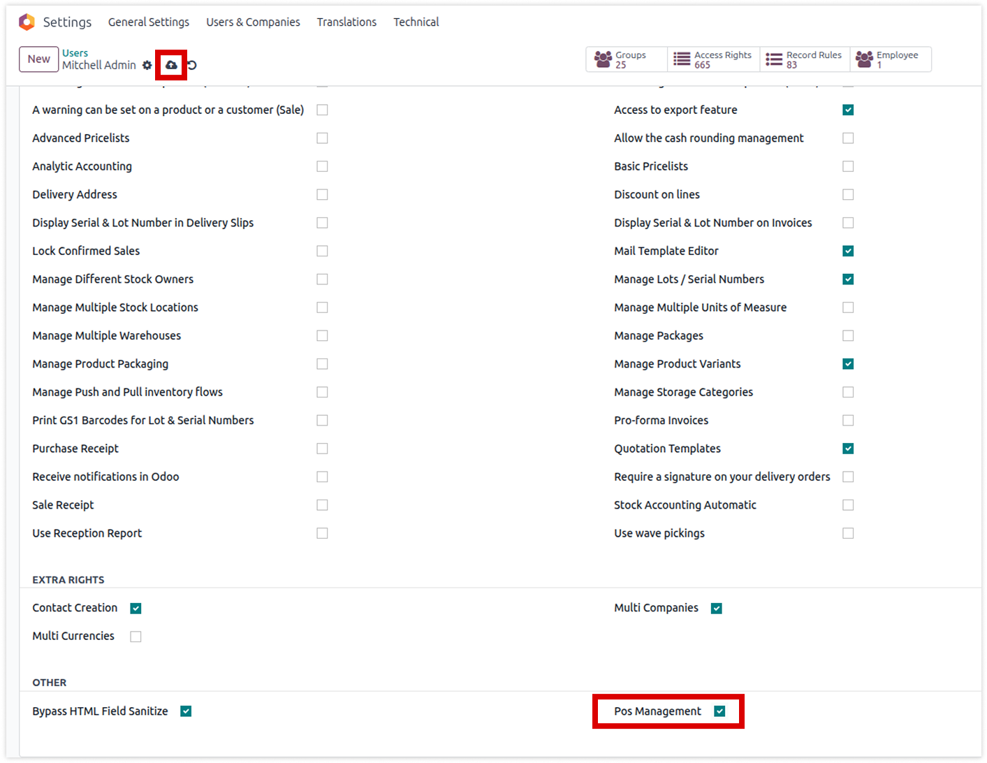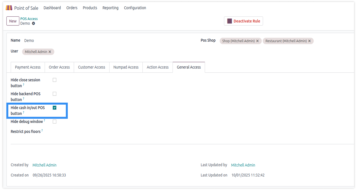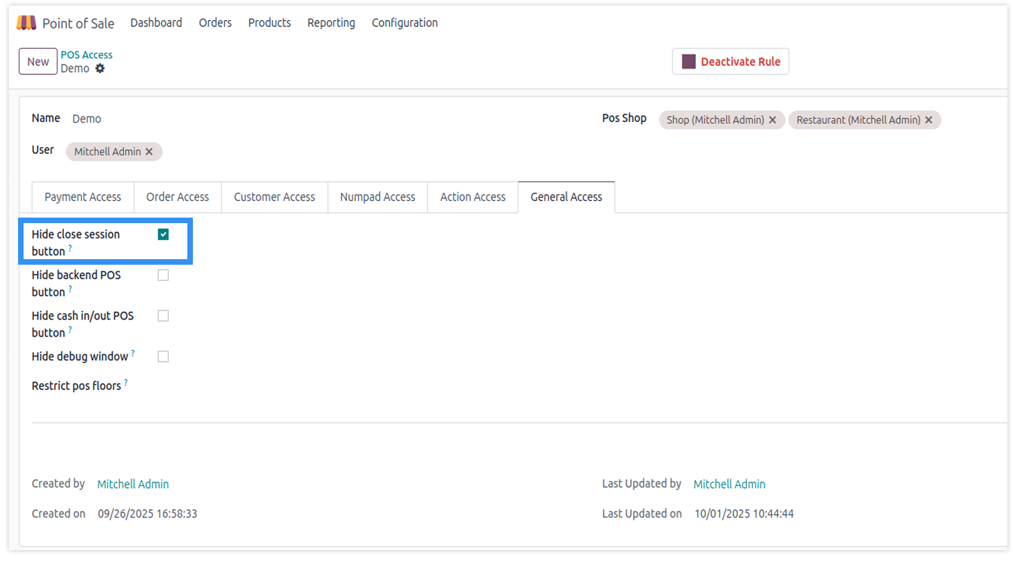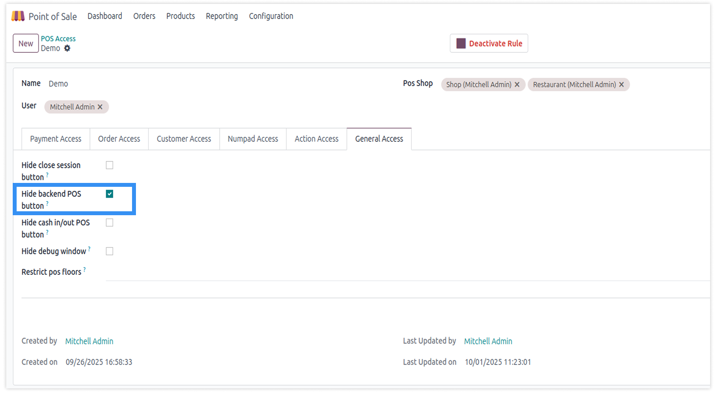 General access rights hide the close session, backend POS, cash in/out, debug buttons, and restrict POS floor access.