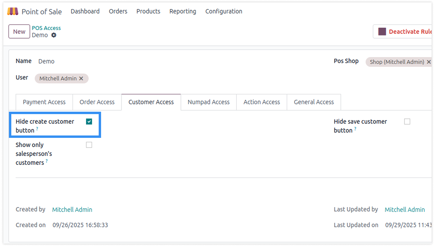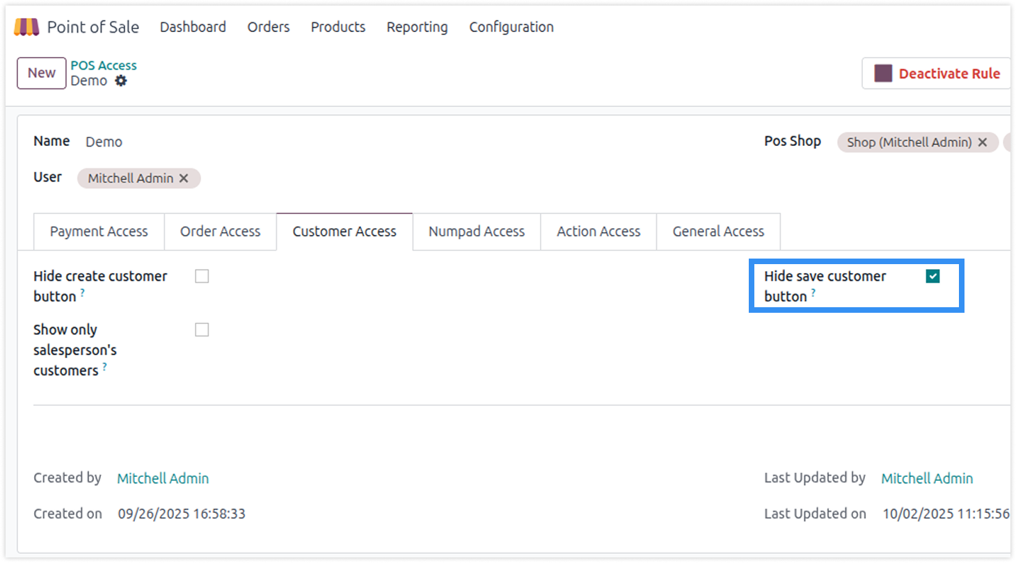 Hide buttons like customer, create, and save from specific users to keep customer details private.