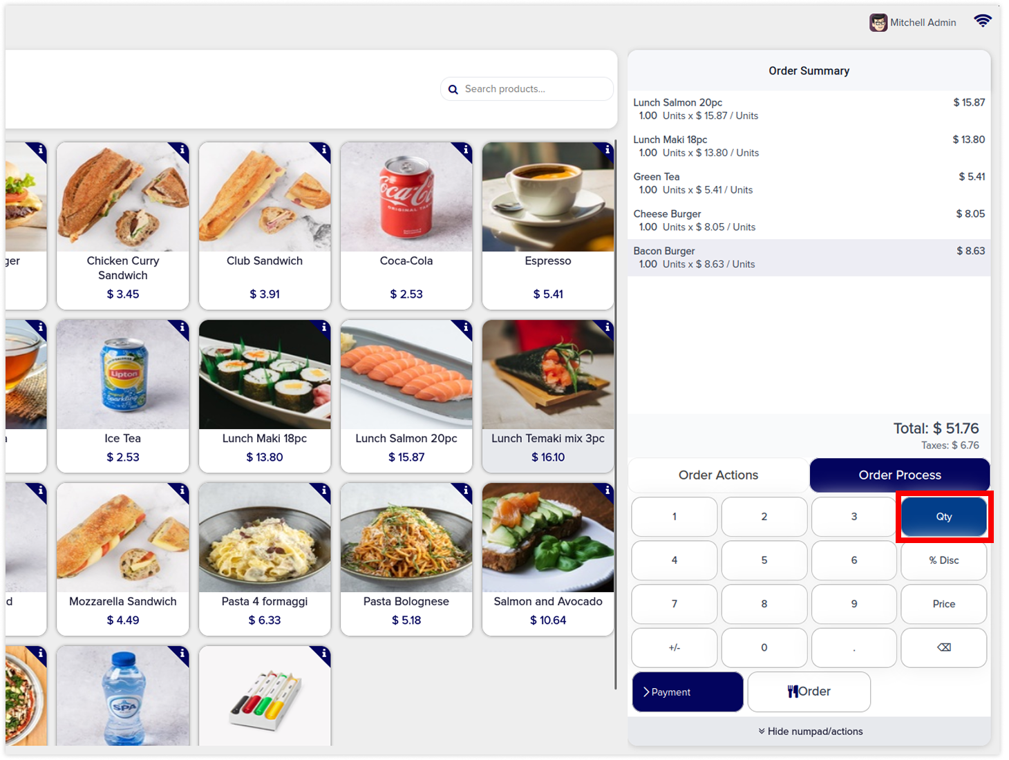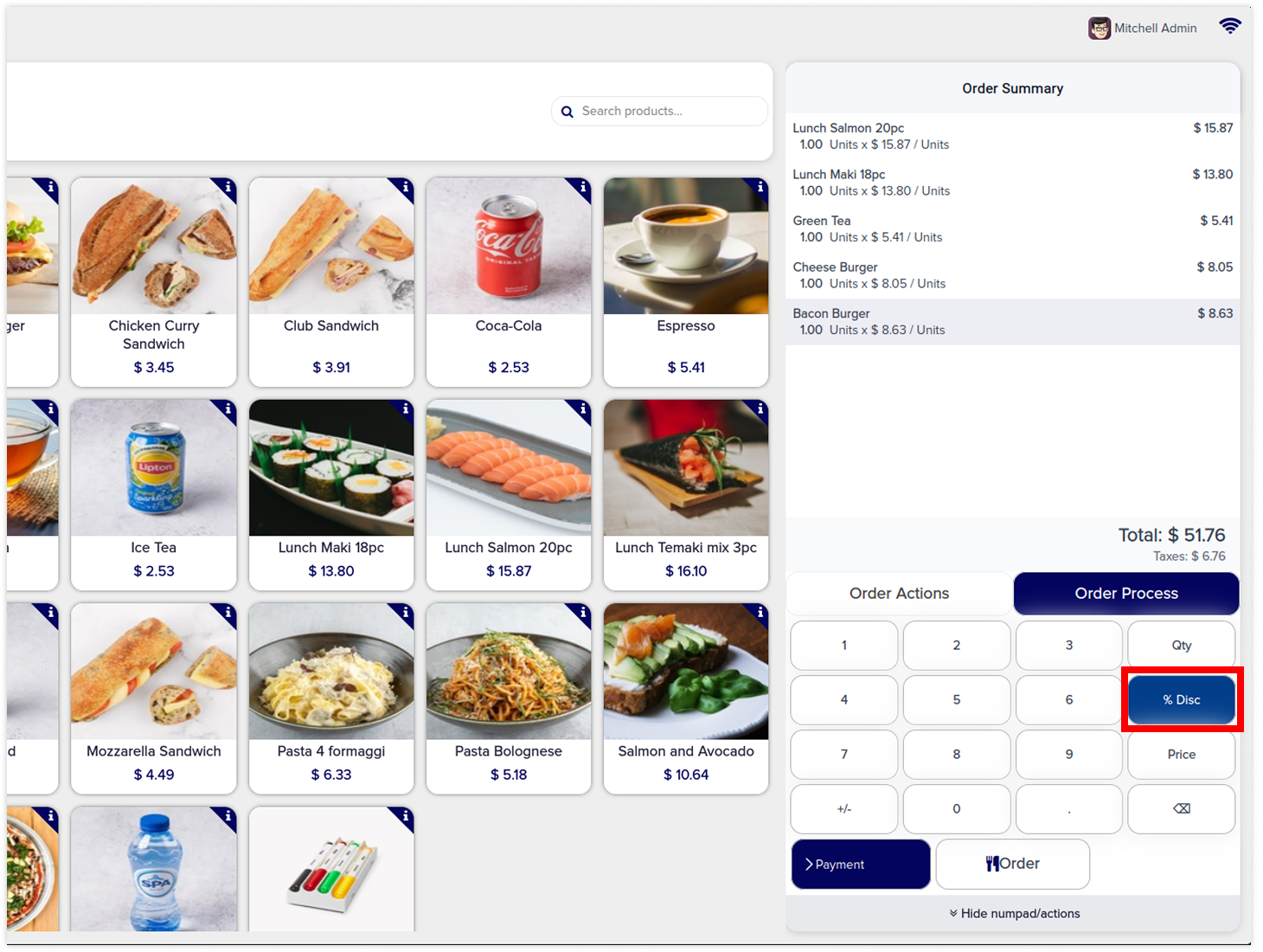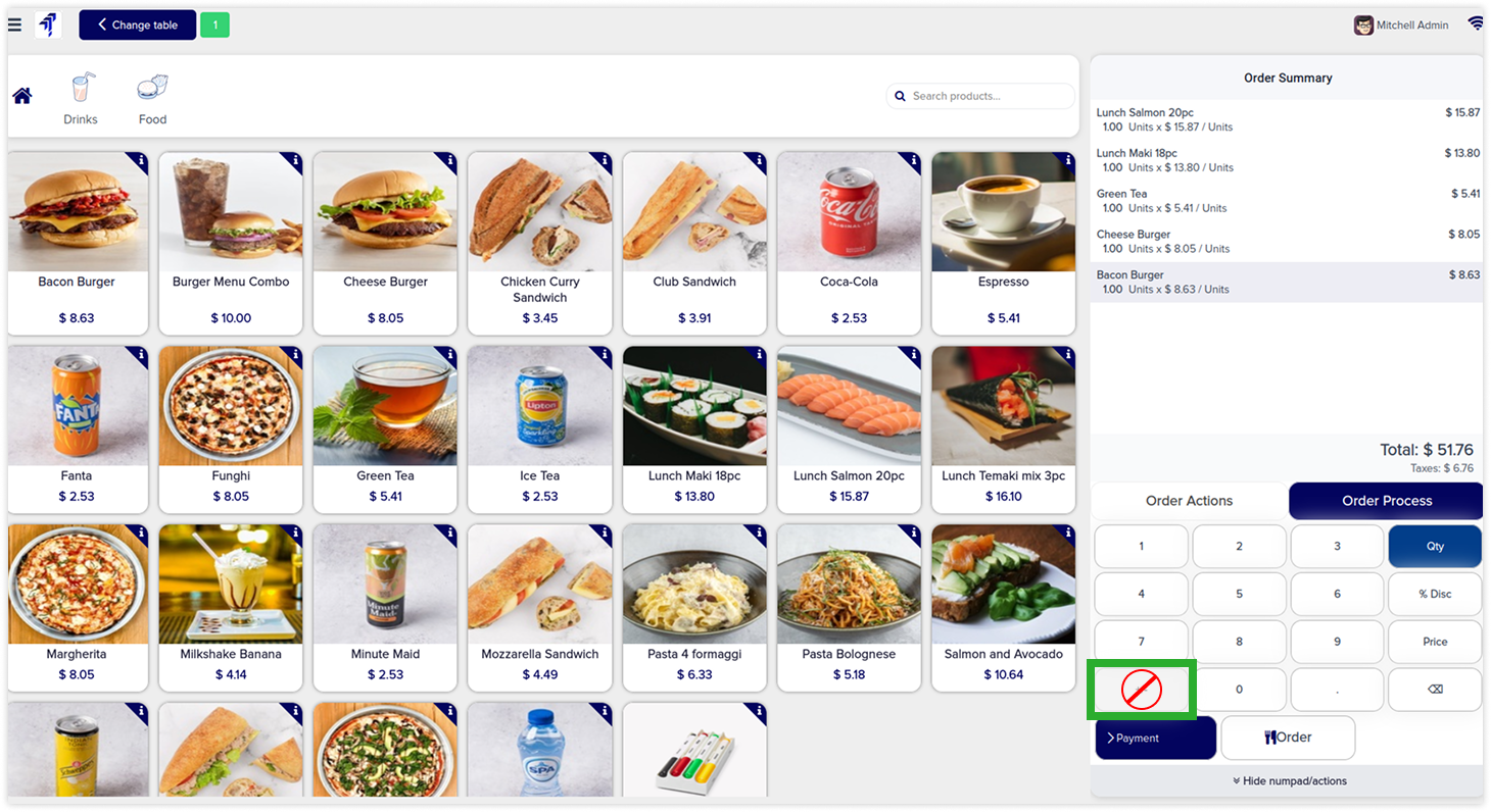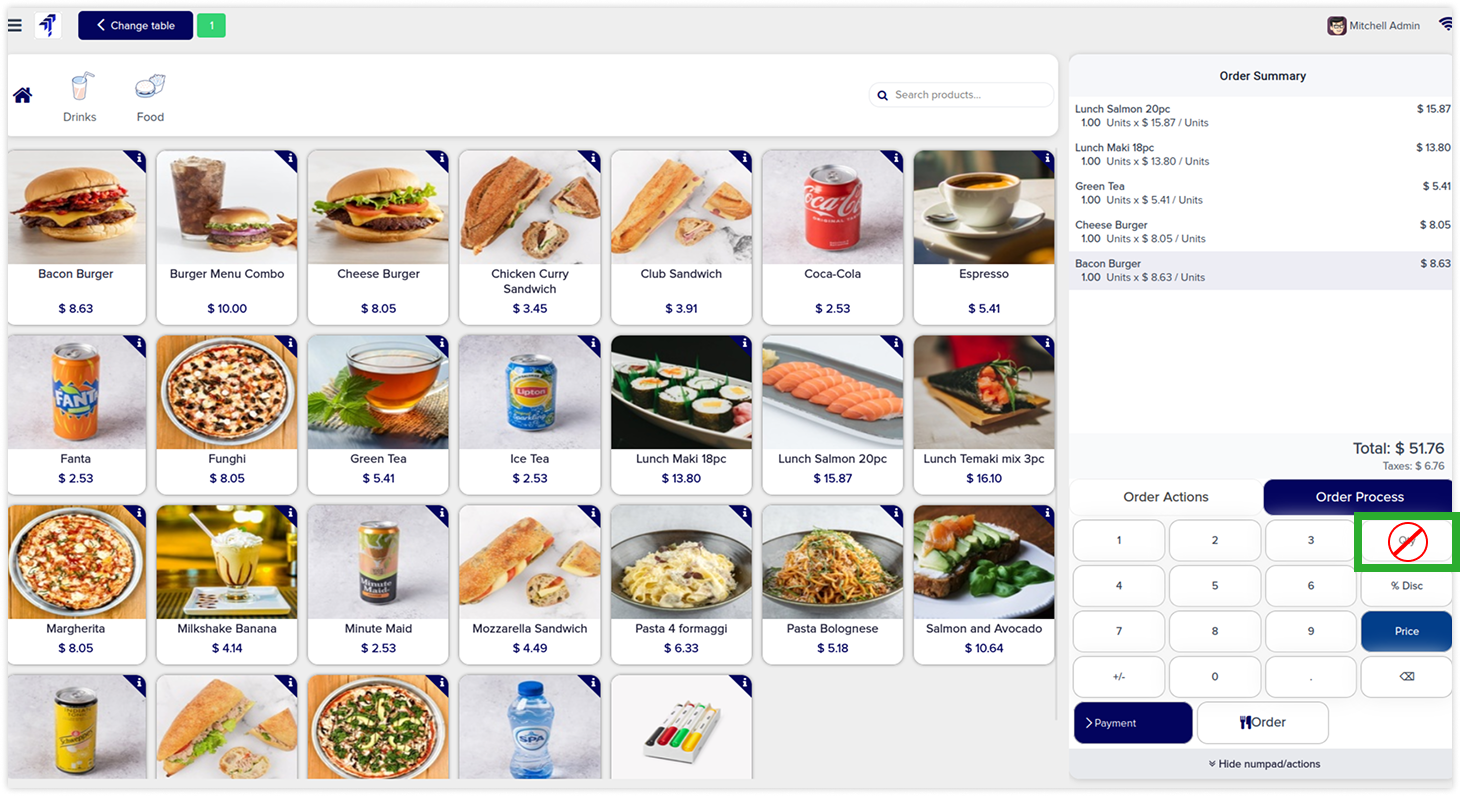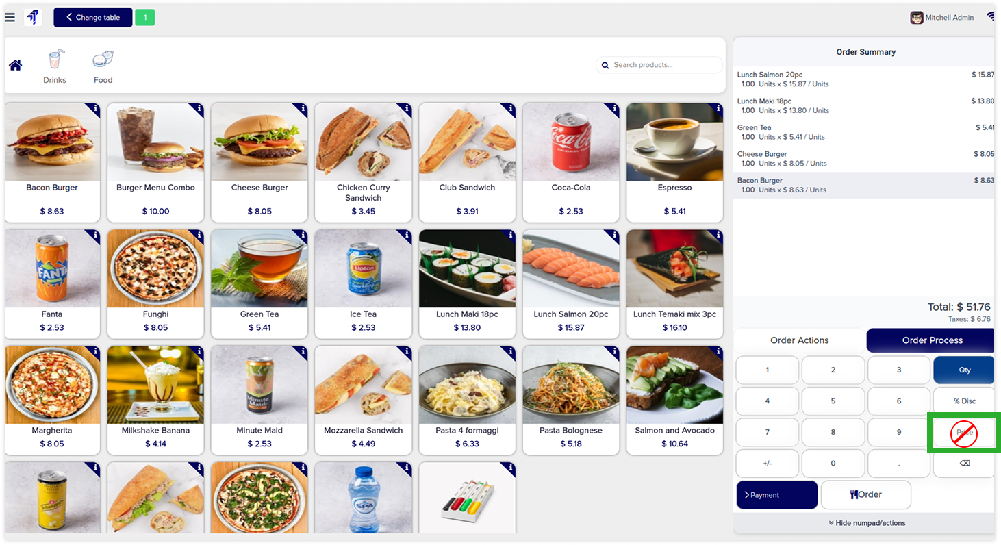 Numpad access rights hide numpad buttons and disable the ±, price, quantity, and discount buttons.