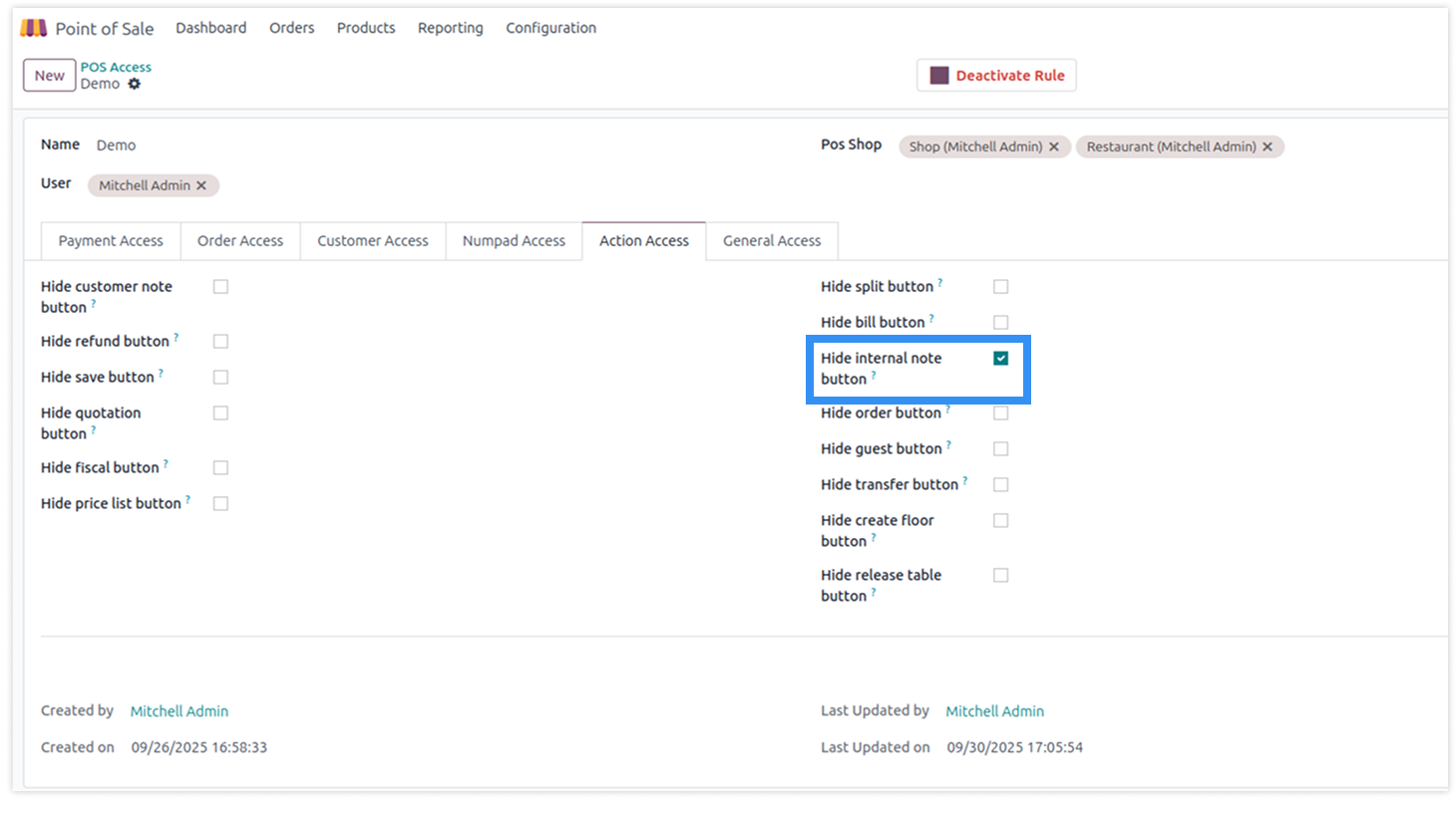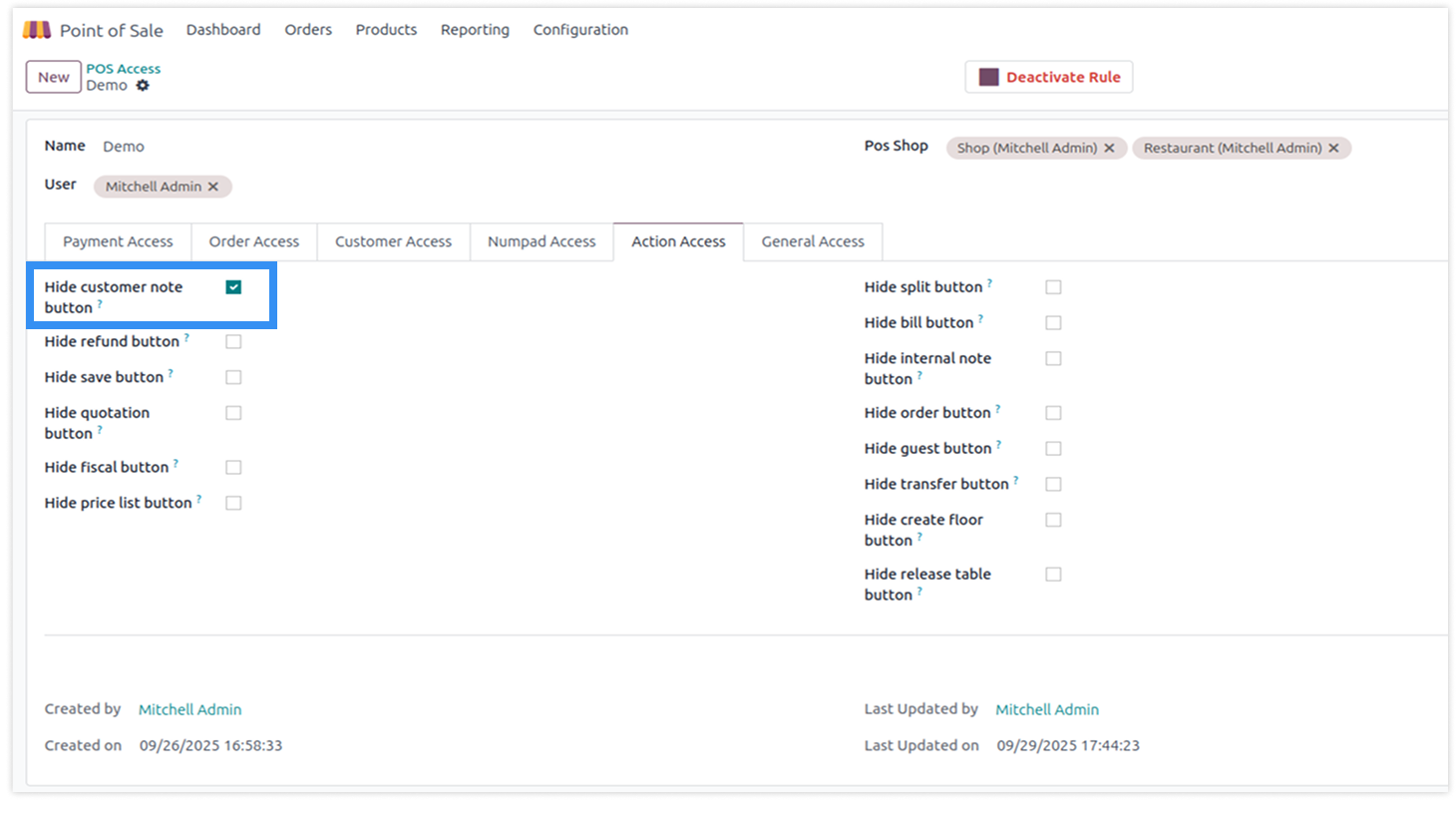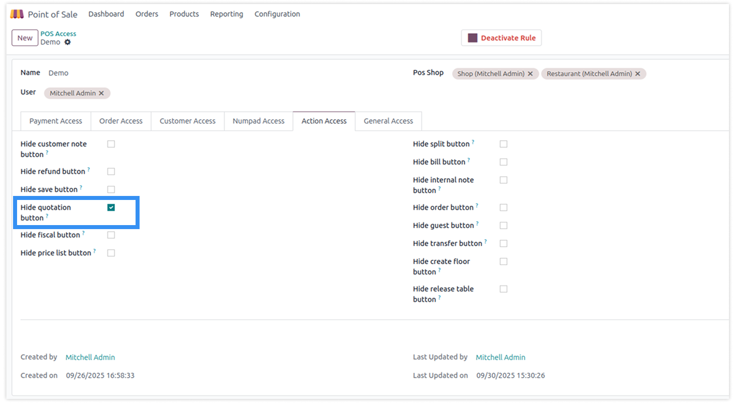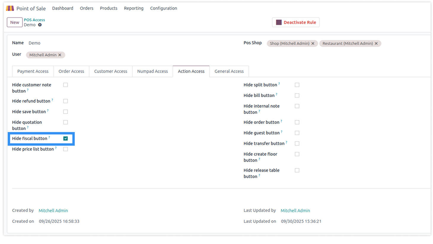 Action access rights hide buttons for customer notes, refunds, quotations, fiscal positions, pricelists, split bills, bills, internal notes, orders, guests, and transfers.