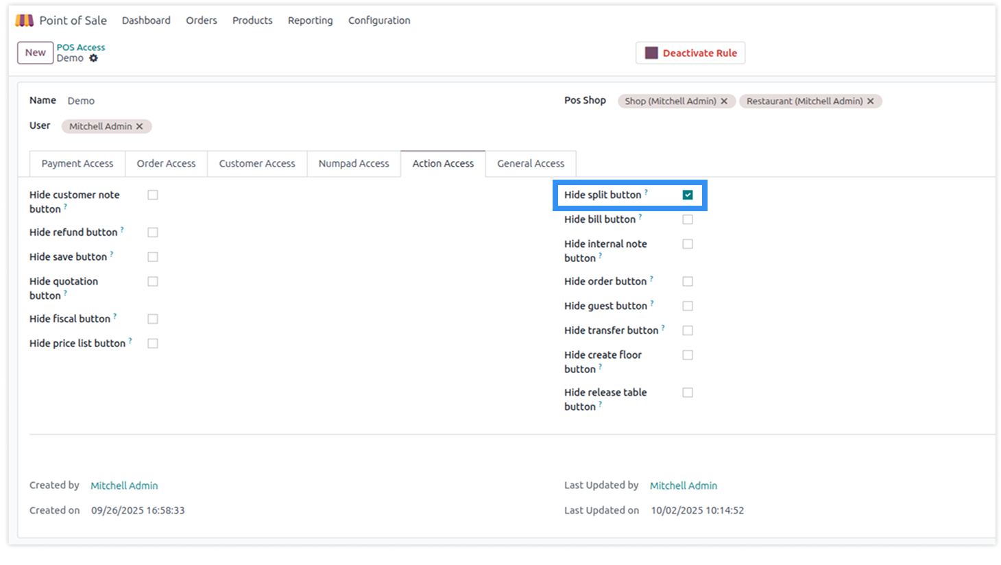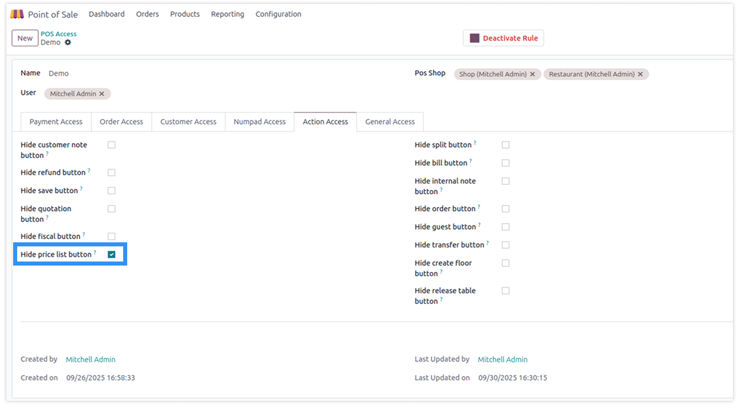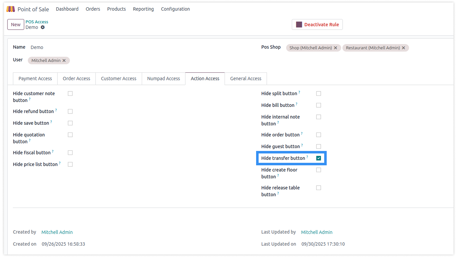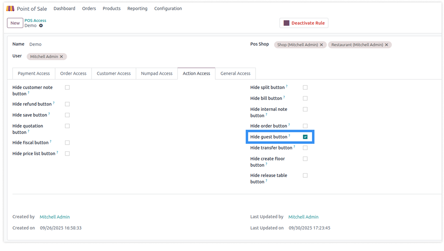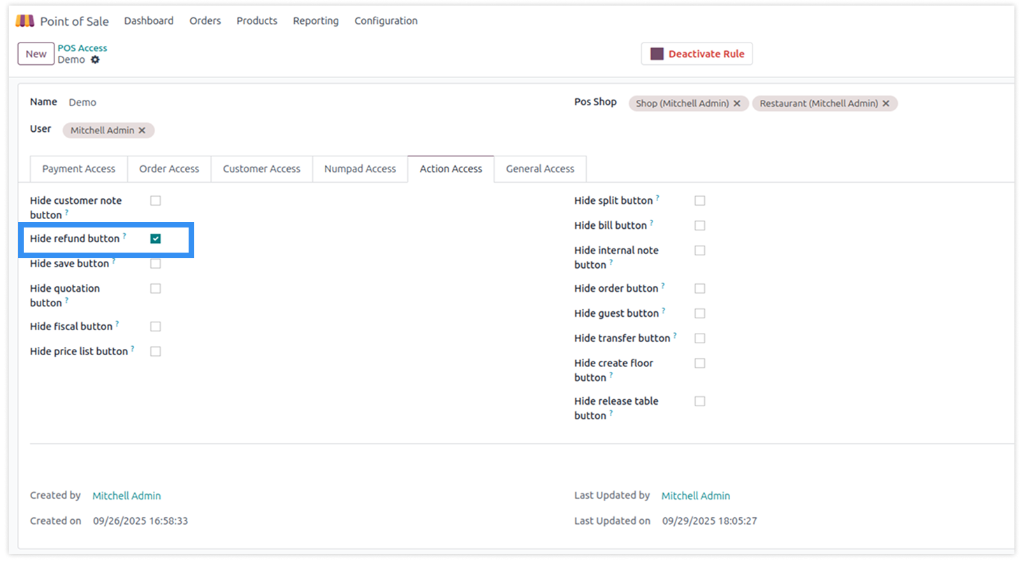 Action access rights hide buttons for customer notes, refunds, quotations, fiscal positions, pricelists, split bills, bills, internal notes, orders, guests, and transfers.