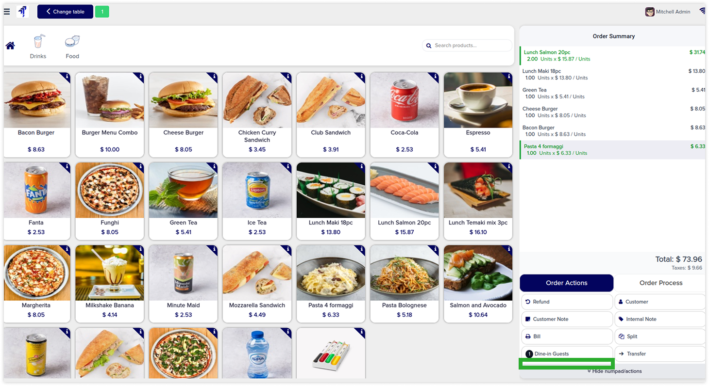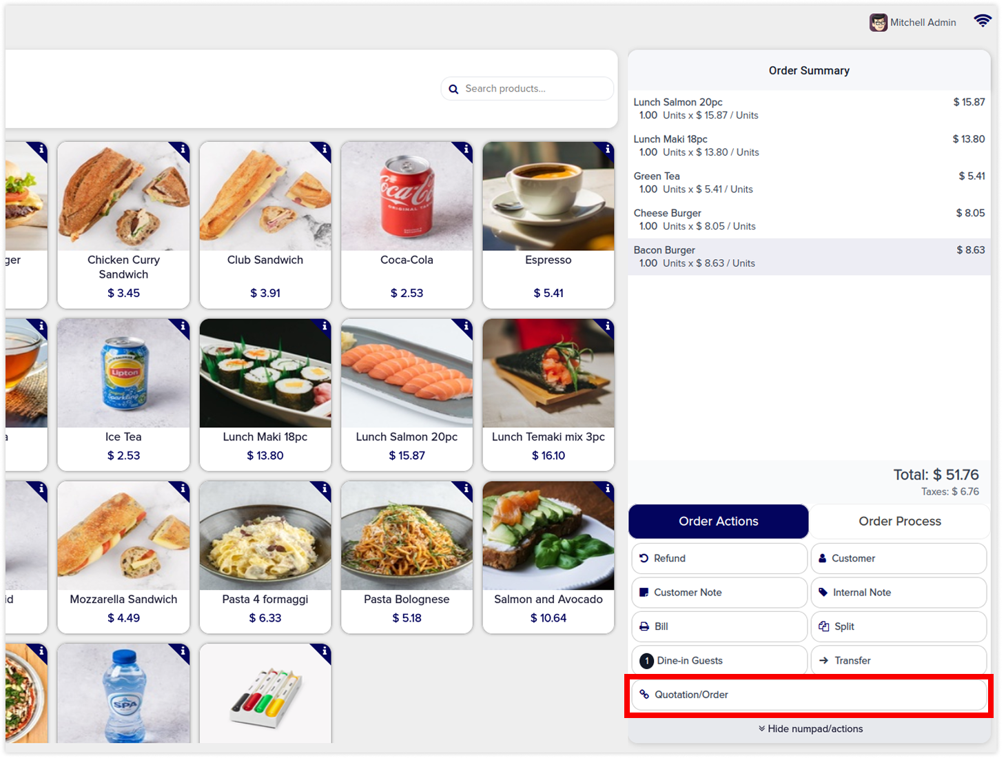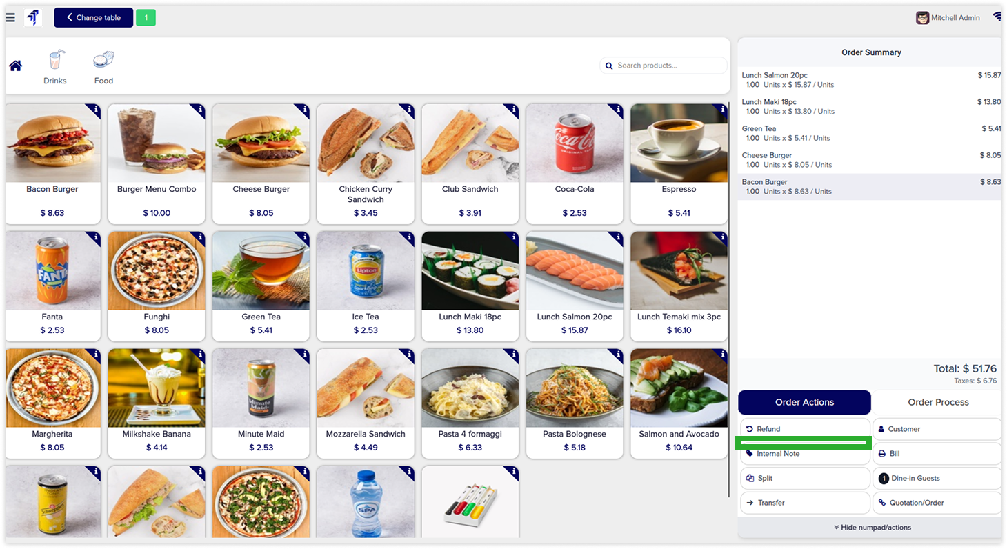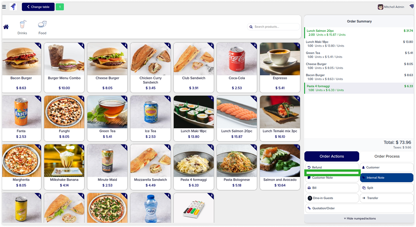 Action access rights hide buttons for customer notes, refunds, quotations, fiscal positions, pricelists, split bills, bills, internal notes, orders, guests, and transfers.