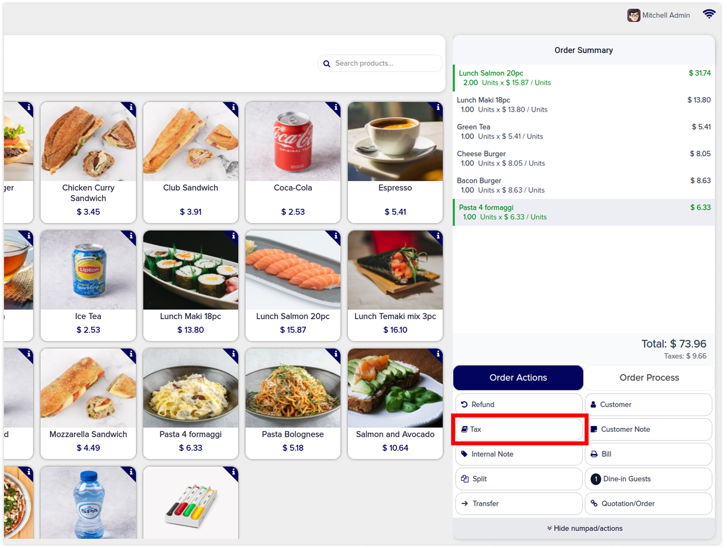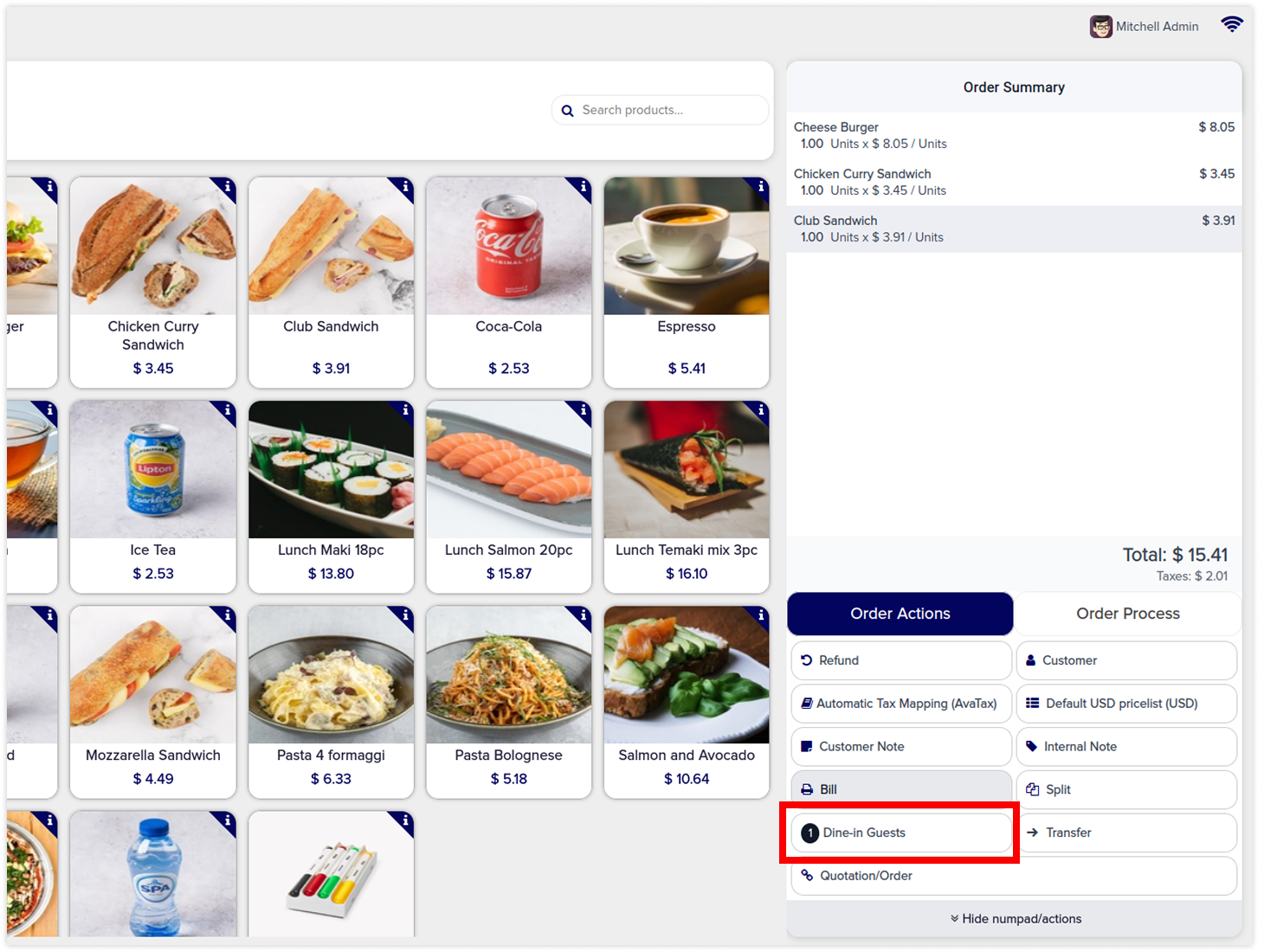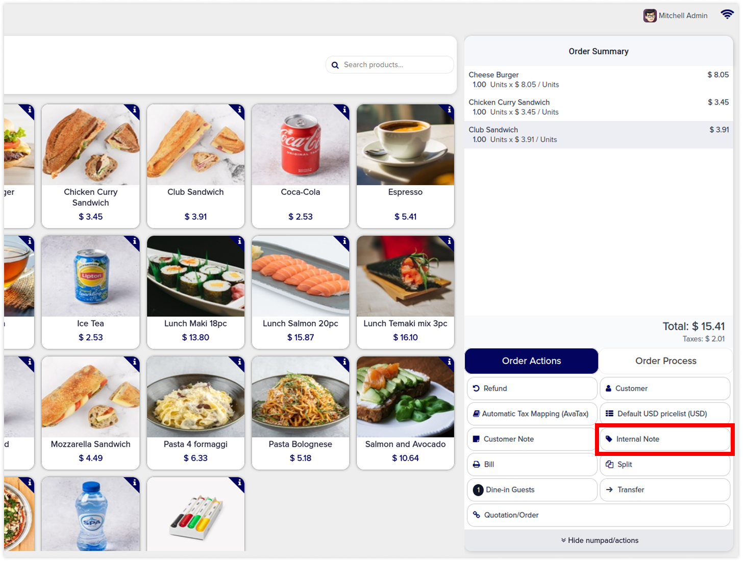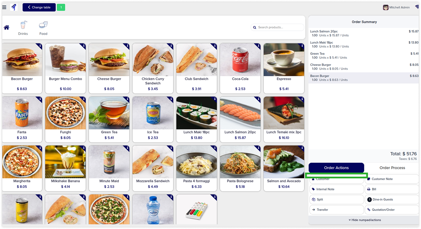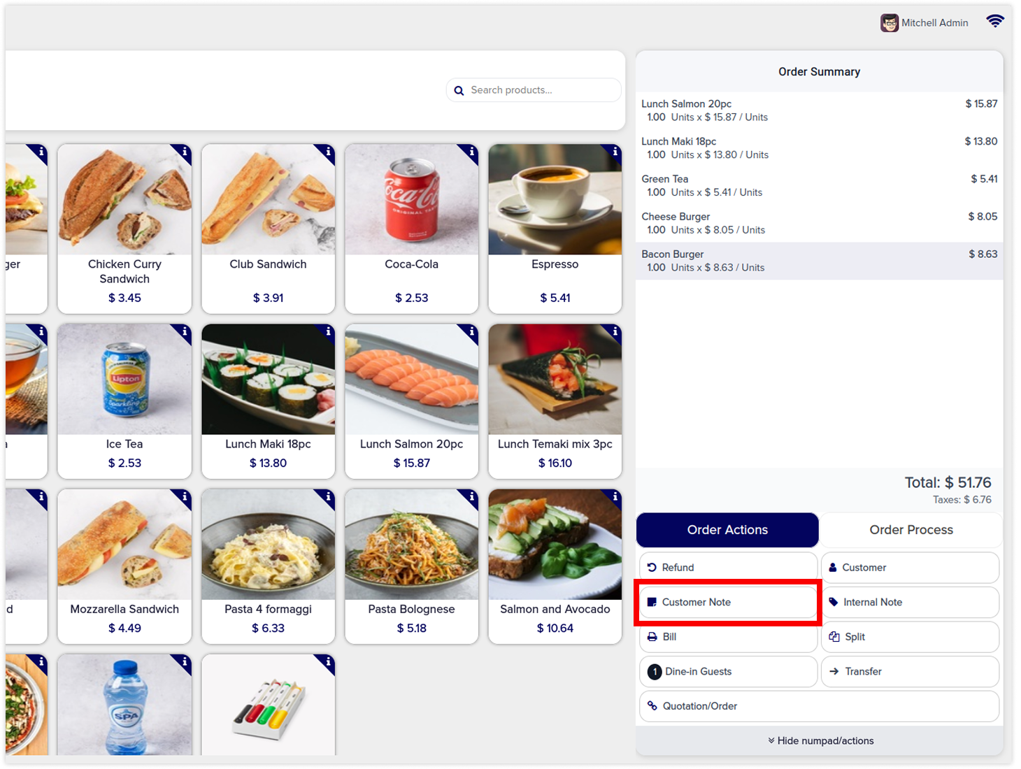 Action access rights hide buttons for customer notes, refunds, quotations, fiscal positions, pricelists, split bills, bills, internal notes, orders, guests, and transfers.