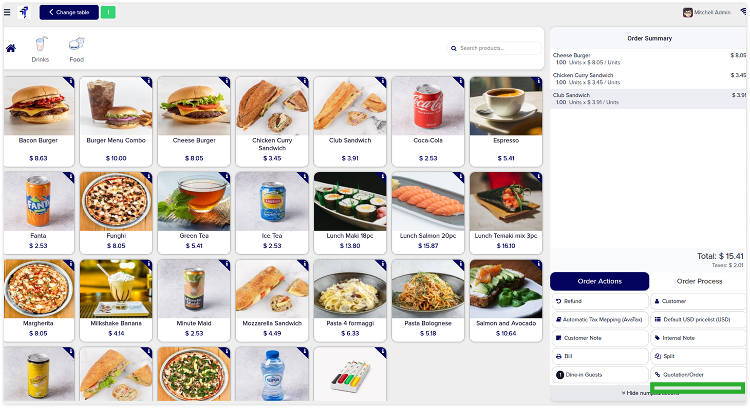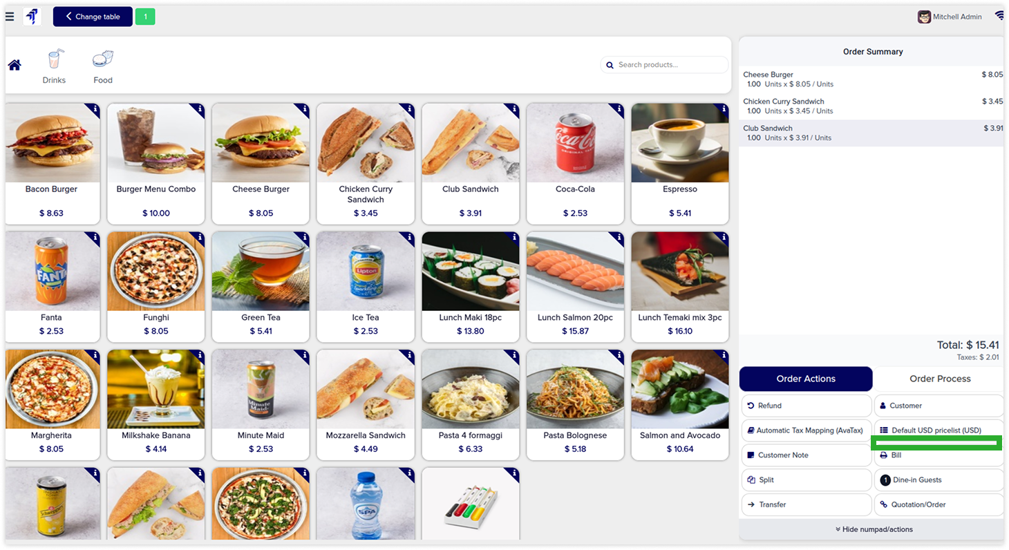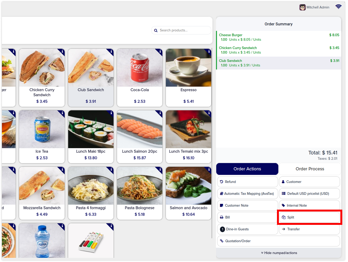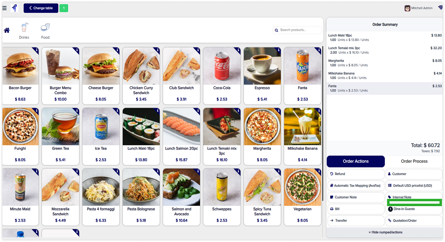 Action access rights hide buttons for customer notes, refunds, quotations, fiscal positions, pricelists, split bills, bills, internal notes, orders, guests, and transfers.